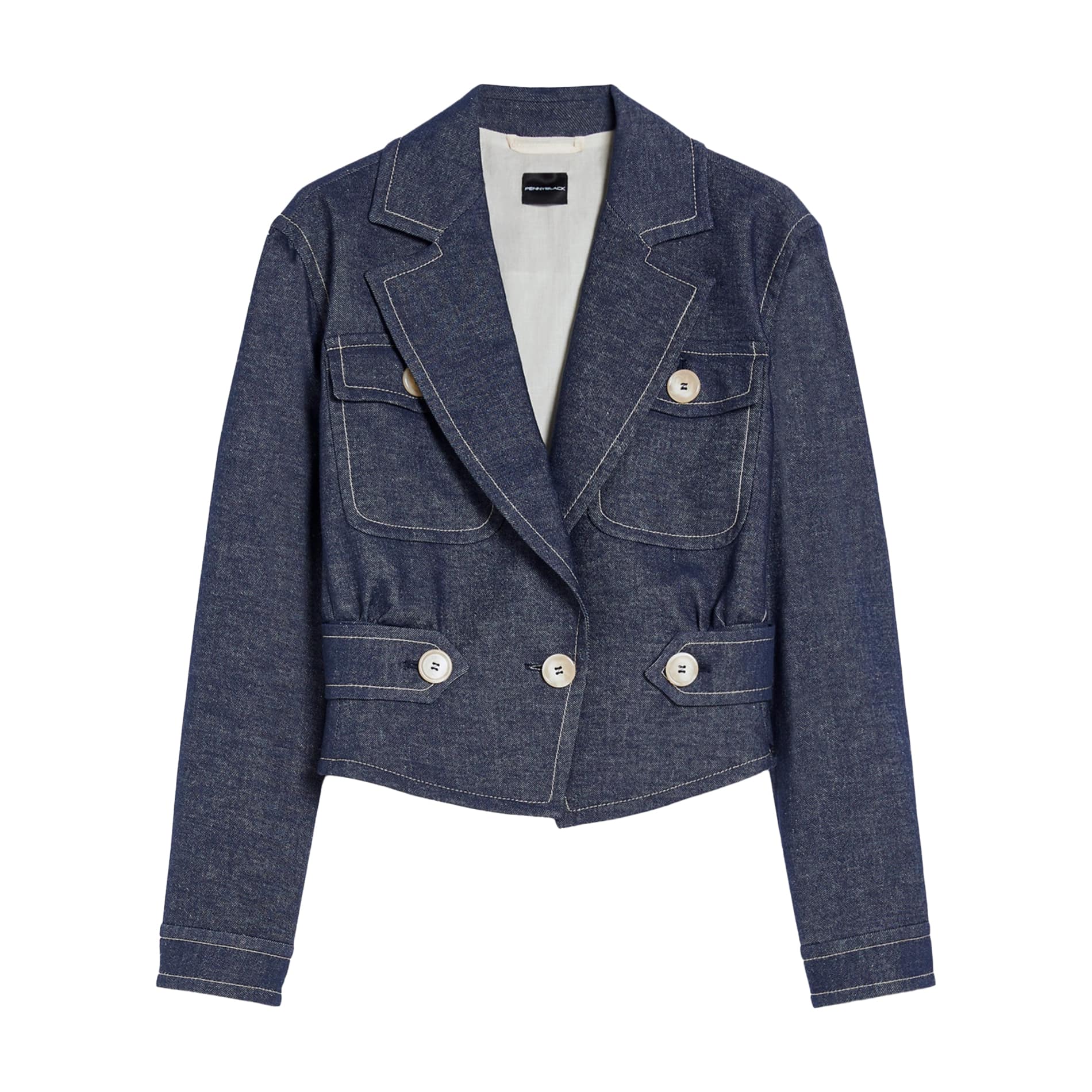 Blauw jasje van Pennyblack, model Dilly in navy. Dit getailleerd jasje is gemaakt van stretch denim dat samengesteld is uit katoen en linnen, heeft een korte, slim fit pasvorm. Het jasje sluit aan de voorzijde met een knoop, heeft twee borstzakken en valt boven de heup.