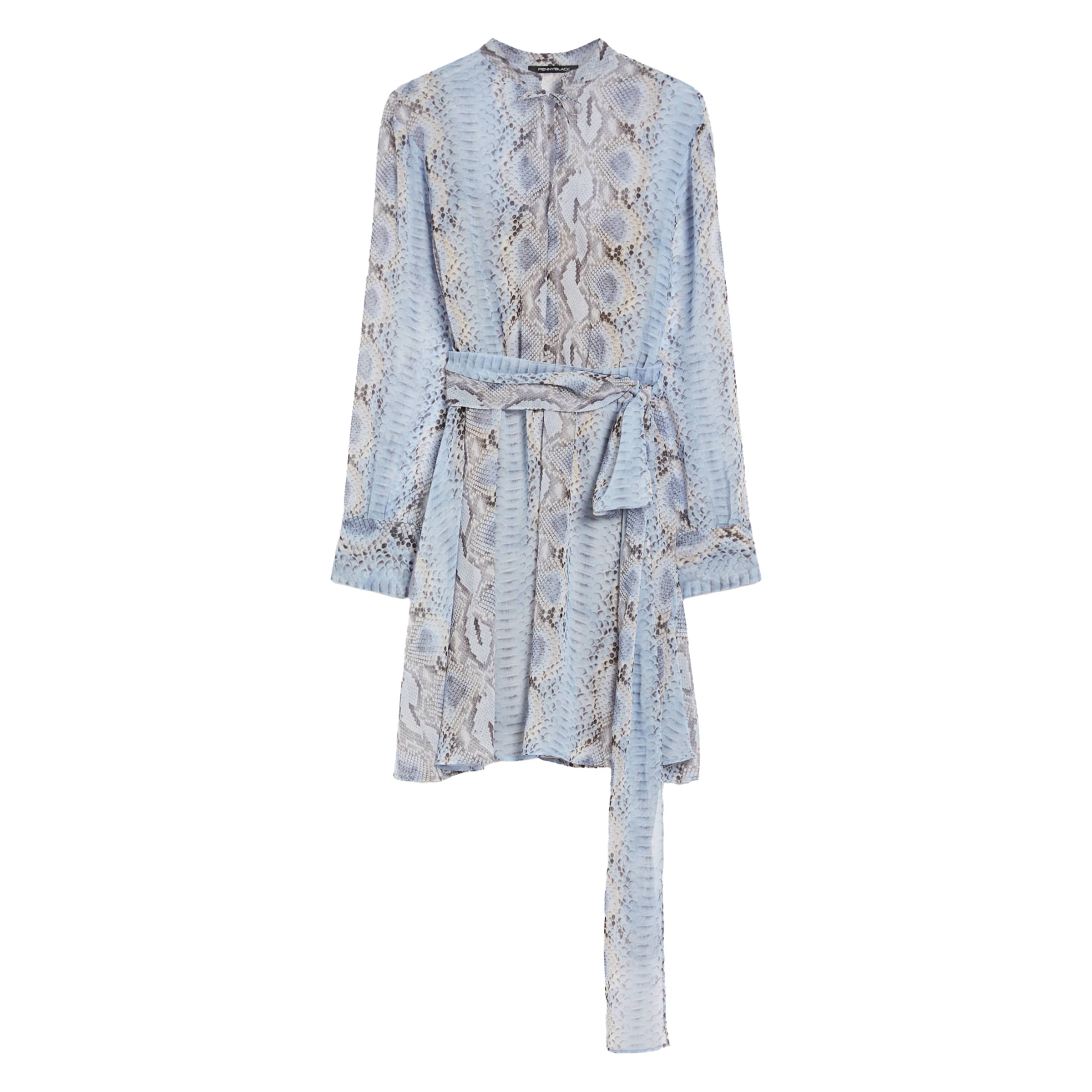 Kort kleedje van Pennyblack, model animal-print georgette dress in light blue. Deze jurk heeft een vaste onderjurk en is gemaakt van een licht georgette stof met python print. De jurk heeft licht doorschijnende mouwen, V-hals, een elastische taille met lange linten die je taille accentueren en valt op de bovenbenen.