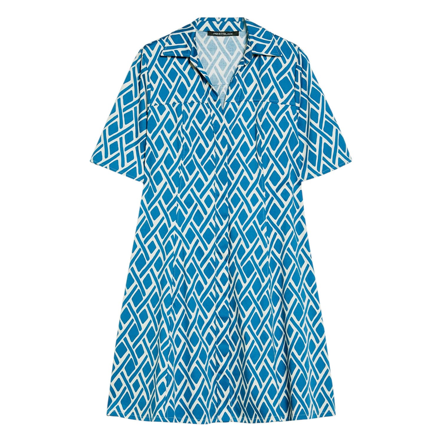Kort kleedje van Pennyblack, model cotton satin shirt dress in turquoise. Deze jurk is gemaakt van stretch katoen en sluit aan de voorzijde met een verborgen knoopsluiting. De jurk heeft korte mouwen, V-hals en een belijnde body met uitlopende rok.