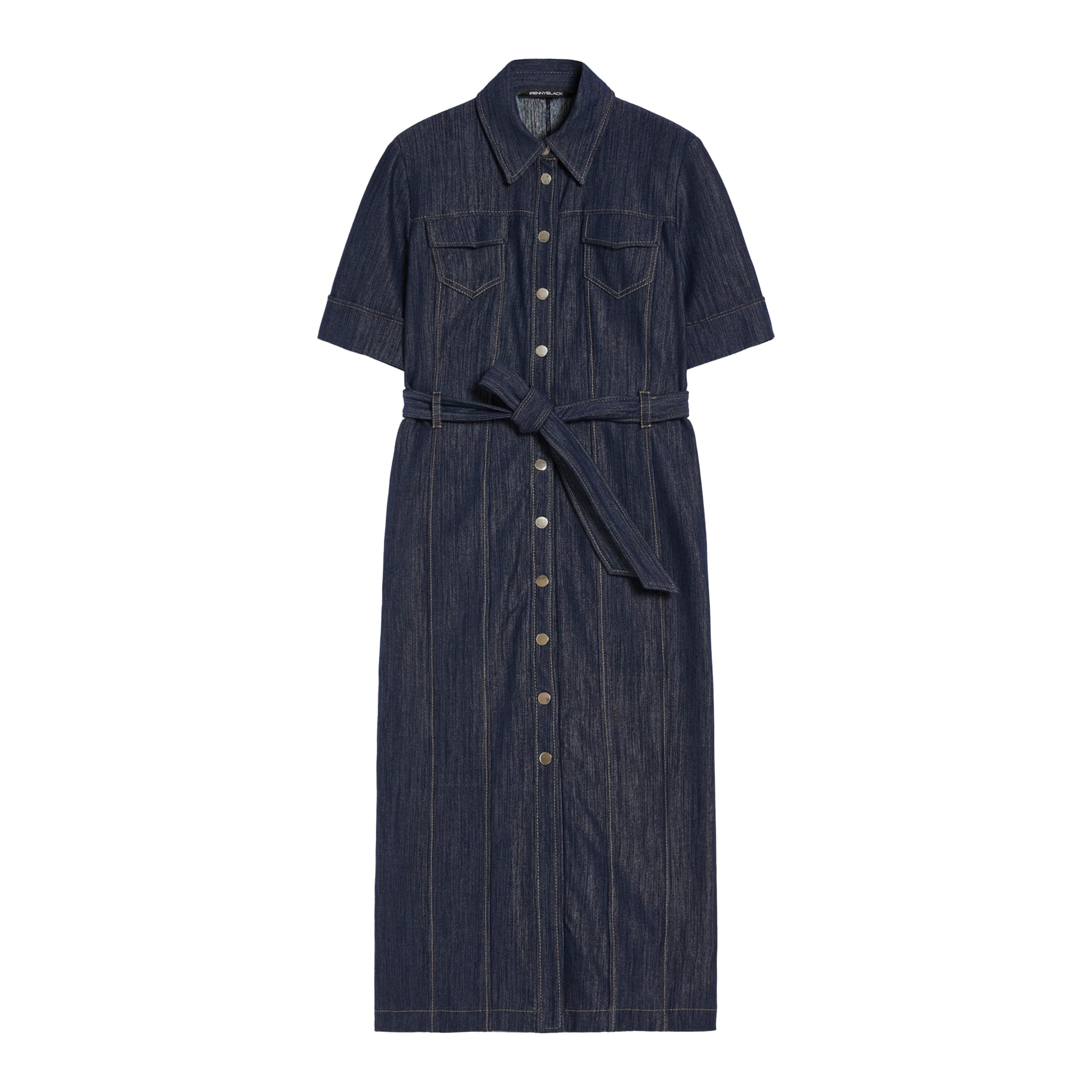 Lang denim kleedje van Pennyblack, model jersey midi shirt dress Saturno. Deze midi jurk is gemaakt van een denim stretch stof en sluit aan de voorzijde met drukknopen. De jurk heeft twee borstzakken, korte mouwen met een vaste overslag en een bijpassende ceintuur.