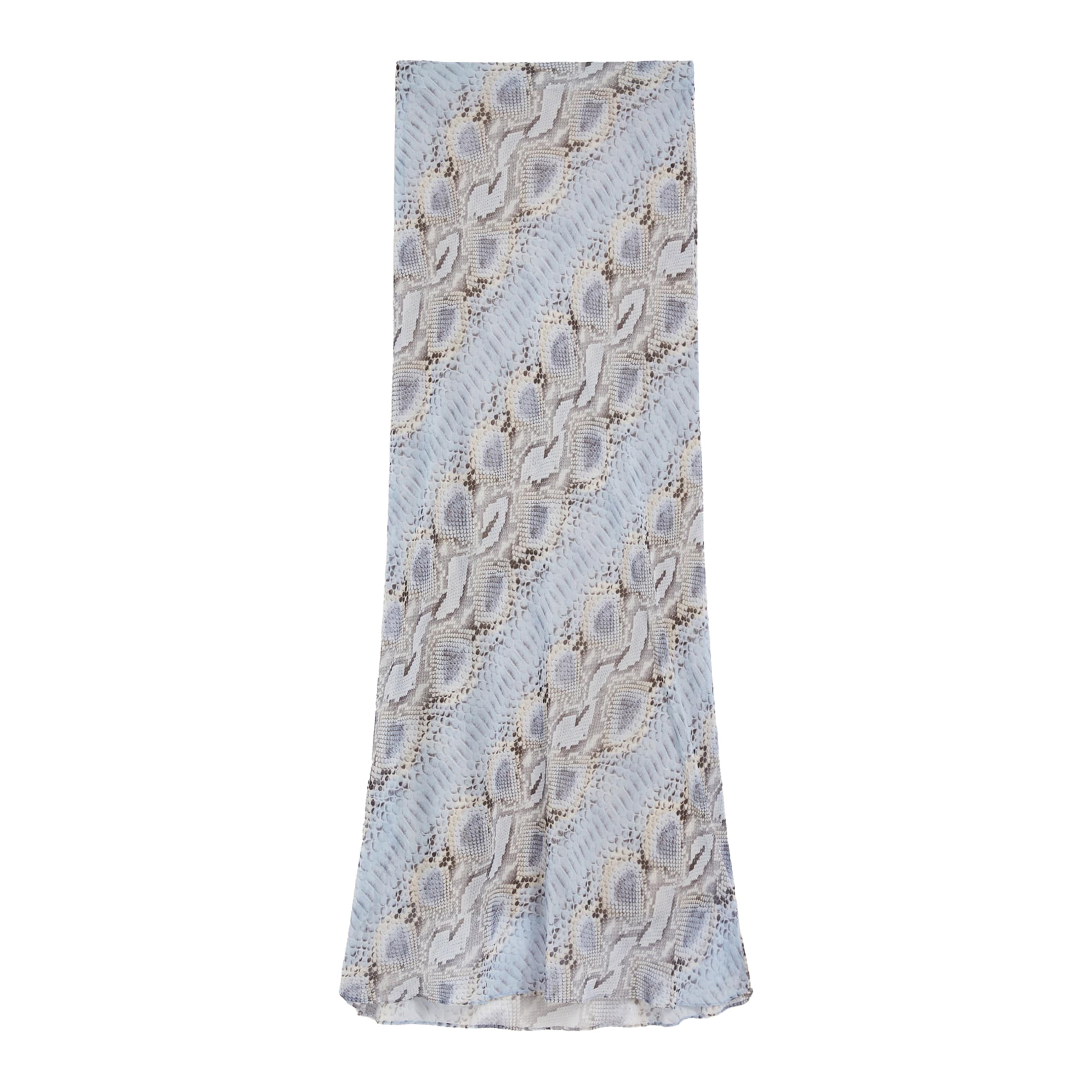 Maxi rok van Pennyblack, model animal-print georgette skirt in light blue. Deze maxi rok is gevoerd en gemaakt van een licht georgette stof met python print. Deze lange rok heeft een elastische taille en een aan de onderzijde uitlopend pasvorm.