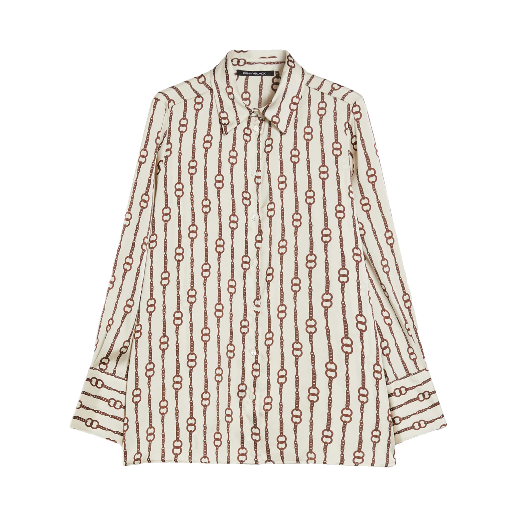 Ivoorkleurige satijnen blouse van Pennyblack, model patterned satin shirt in ivory. Deze blouse is gemaakt van satijnen stof met een bruin ketting motief en heeft een los vallende, rechte pasvorm met twee splitjes aan beide zijden. De blouse heeft een klassieke kraag en lange mouwen.