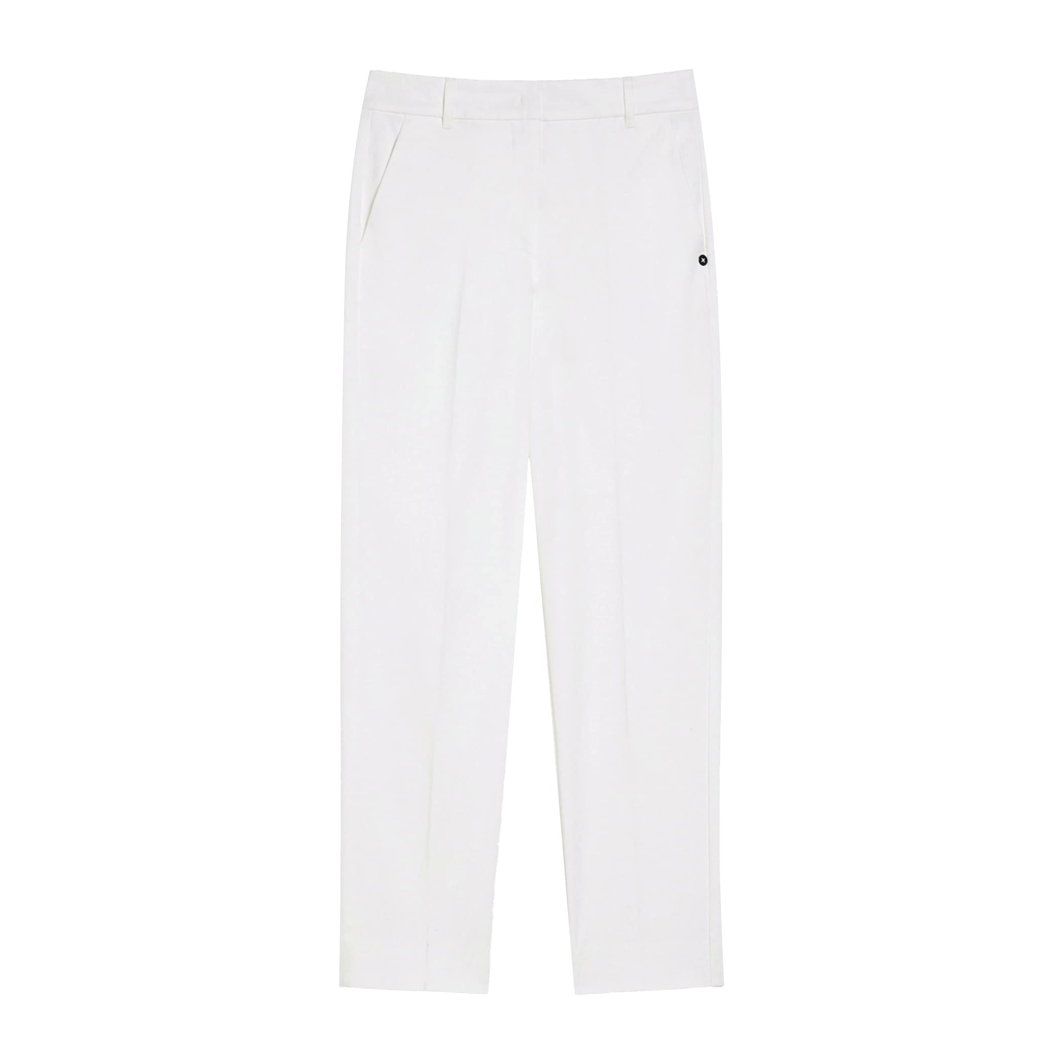 Witte pantalon van Pennyblack, model PennyNY slim-fit stretch trousers in optical white. Deze broek is gemaakt van stretch katoen en heeft toelopende broekspijpen. De pantalon sluit met een haakje, knoop- en ritssluiting, heeft een mid-rise taille, twee steekzakken en twee paspelzakken.