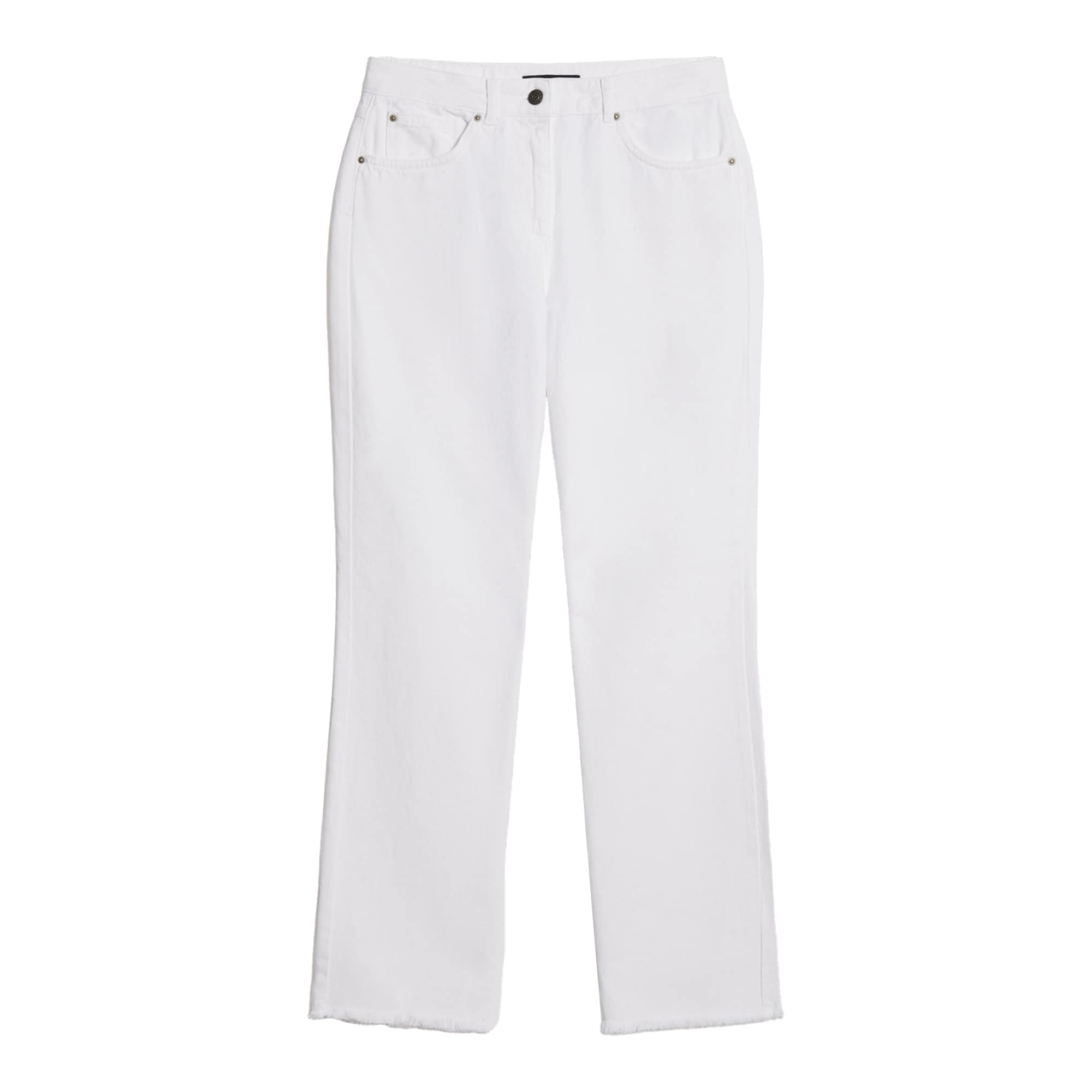 Witte jeans Pennyblack, model PBstraight straight-fit jeans in white. Deze jeans is gemaakt van witte denim en heeft aan de onderzijde fijn gerafelde broekspijpen met een split aan de binnenkant. De jeans sluit met een knoop- en ritssluiting, heeft een hoge taille, twee steekzakken en twee achterzakken en rechte broekspijpen.