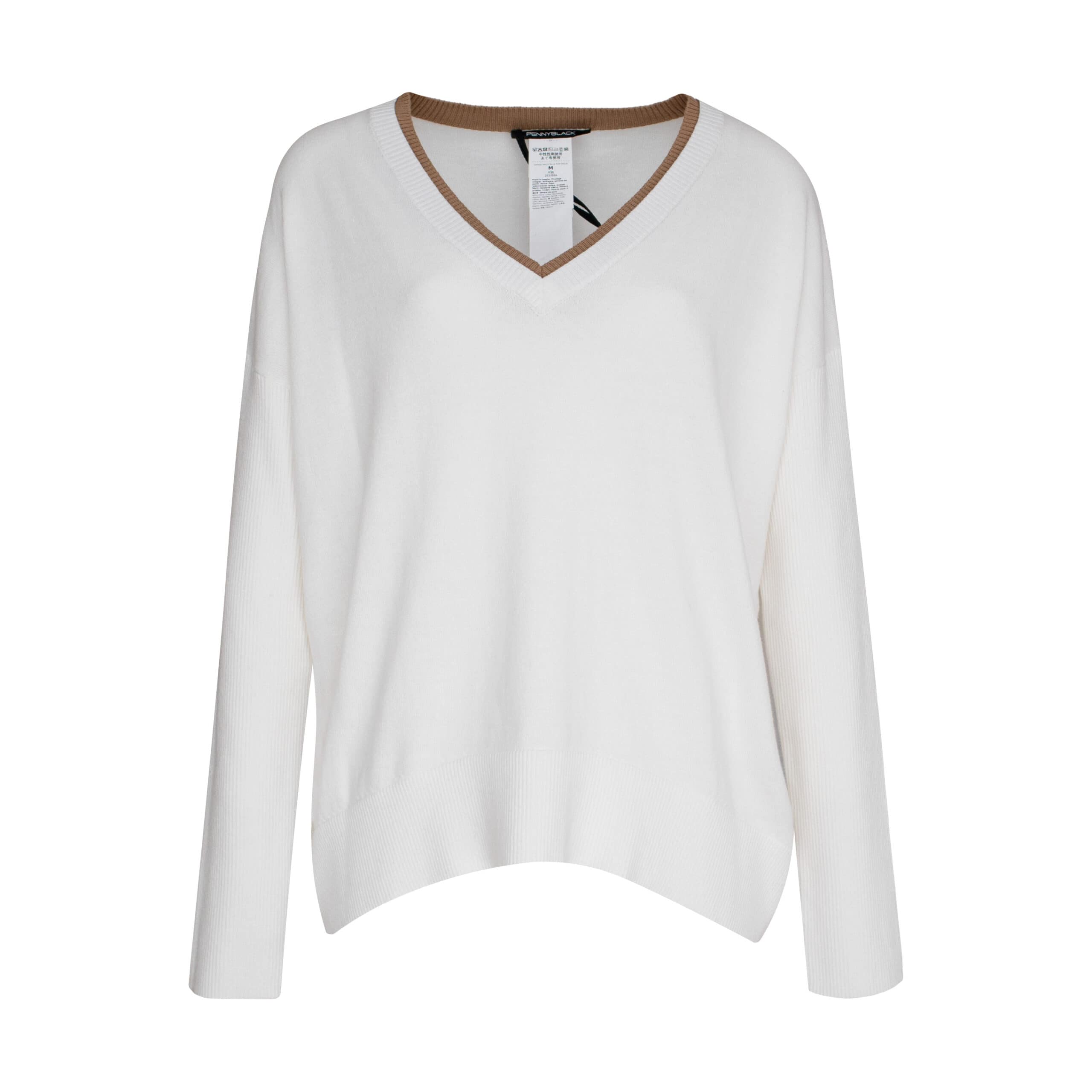 Off white pull van Pennyblack, model Dimora in off white. Deze fijn gebreide trui is gemaakt van een katoen met kasjmier mix en heeft geribbelde lange mouwen. De trui heeft een dubbele off white, bruine V-hals en een los vallende, boxy pasvorm.
