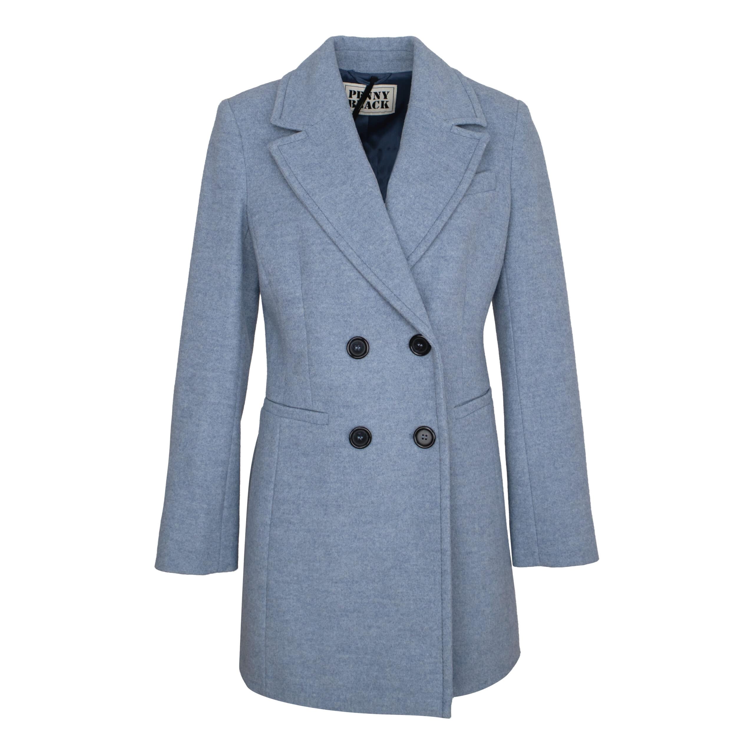 Lichtblauwe jas van Pennyblack, model Satrapo in azzurro melange. Deze getailleerde wollen jas sluit met een dubbele knoopsluiting aan de voorzijde en heeft twee steekzakken. De jas heeft een klassieke revers kraag en valt tot over de heup.