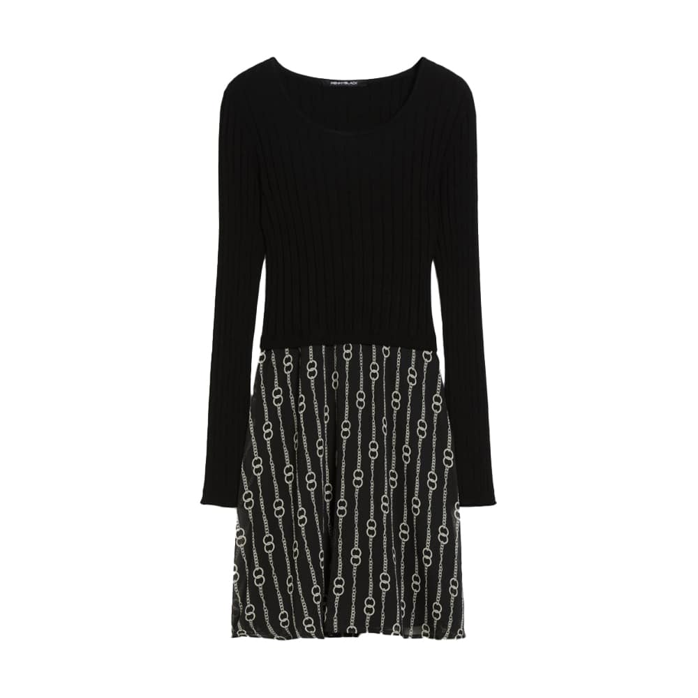 Zwart kleedje van Pennyblack, model knit fabric and crepon dress Eletta in black. Deze korte jurk heeft een zwarte, geribbelde body en een crêpe rok met een ketting motief. De jurk heeft een aansluitende pasvorm met een gevoerde rok, lange mouwen en sluit met een verborgen ritssluiting aan de zijkant.