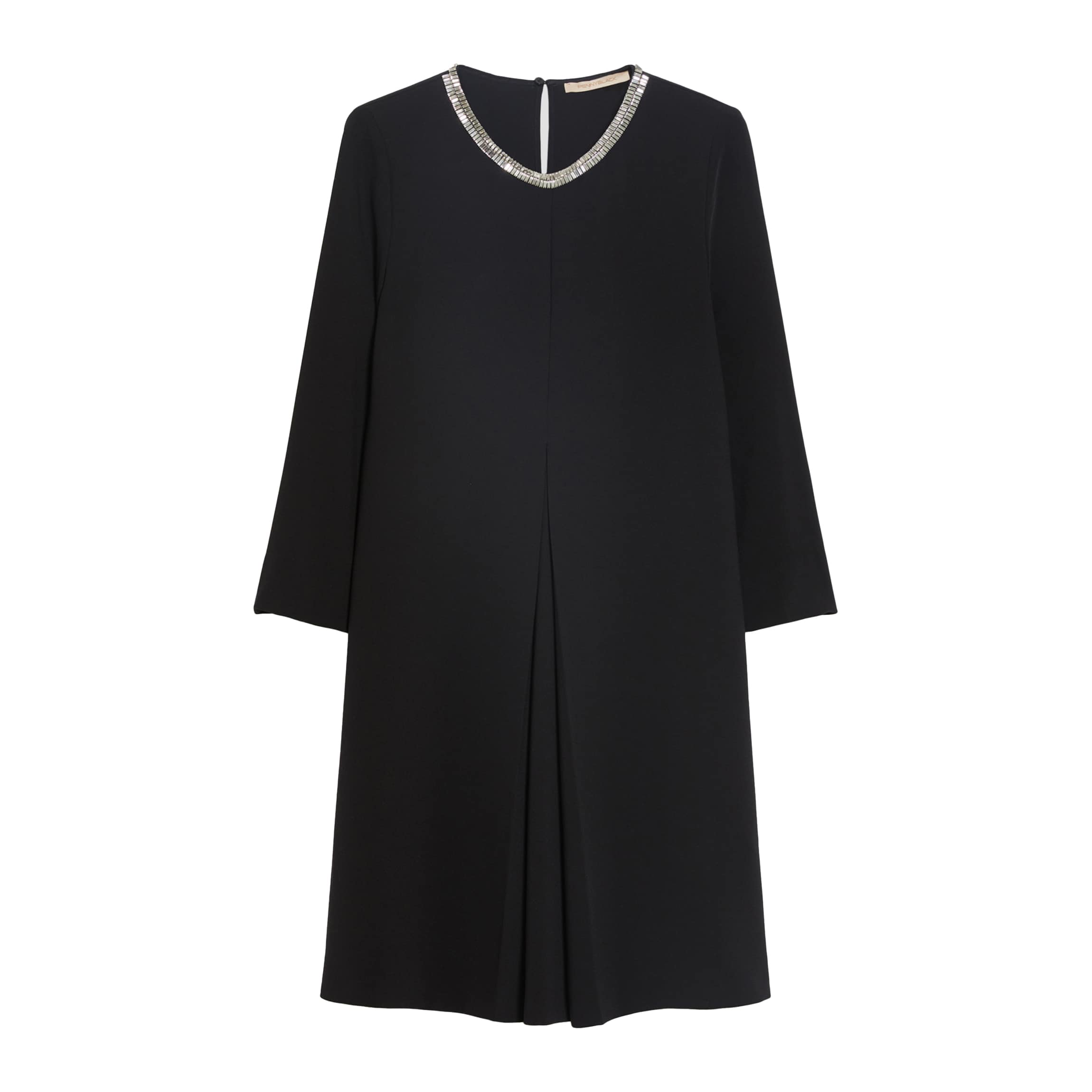 Zwart kleedje van Pennyblack, model Lindor in nero. Deze jurk is gemaakt van zwarte stretch stof, heeft een korte, uitlopende pasvorm en is geplooid aan de voorzijde. De jurk heeft driekwart mouwen, ronde hals die bezet is met strass steentjes en sluit met een klein knoopje aan de achterzijde van de hals.