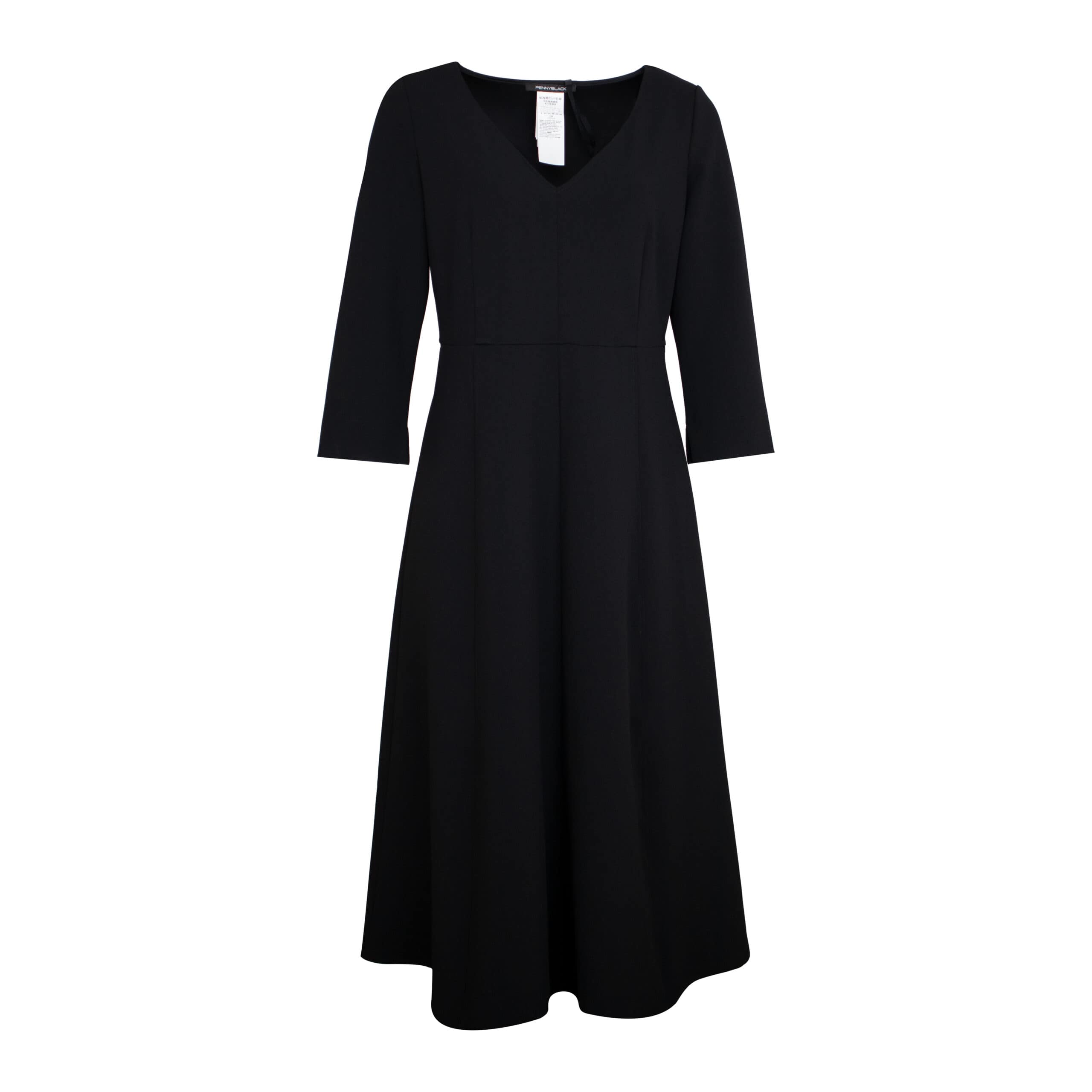 Zwart kleedje van Pennyblack, model Aiello in nero. Deze getailleerde jurk is gemaakt van zwarte stretch stof en sluit aan de zijkant met een verborgen ritssluiting. De jurk is belijnd, heeft lange mouwen, V-hals en een uitlopende rok die op de kuiten valt.