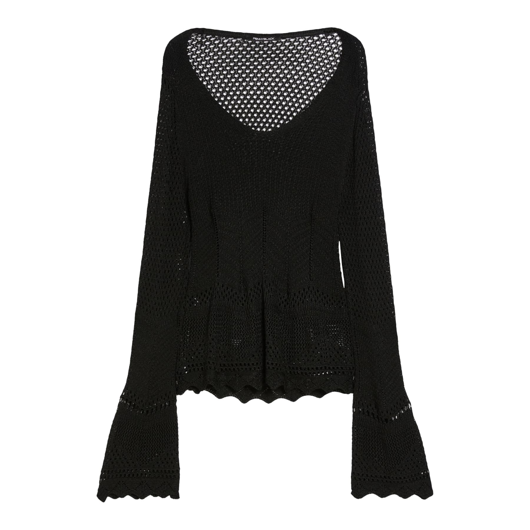 Zwarte pull van Pennyblack, model Salerno in nero. Deze fijn gehaakte trui heeft een aansluitende pasvorm en is geheel opengewerkt in verschillende patronen. De pull heeft een V-hals en lange, uitlopende mouwen.