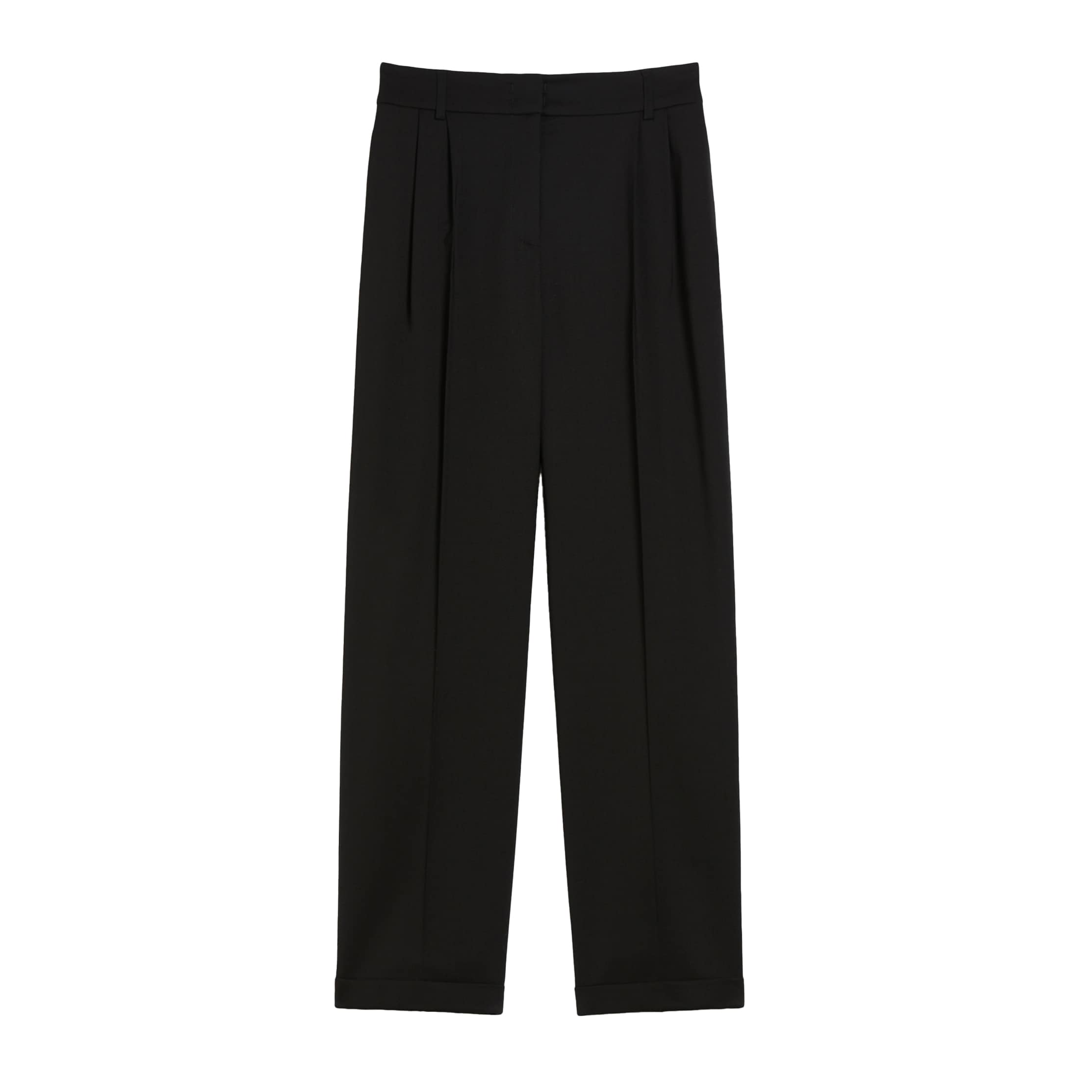 Zwarte pantalon van Pennyblack, model woll twill carrot-fit trousers Virgus in nero. Deze pantalon is gemaakt van zwarte stretch wol en heeft licht toelopende broekspijpen met een vaste omslag. De pantalon sluit met haakjes, knoop- en ritssluiting, heeft een hogere geplooide taille, twee steekzakken en twee paspelzakjes.