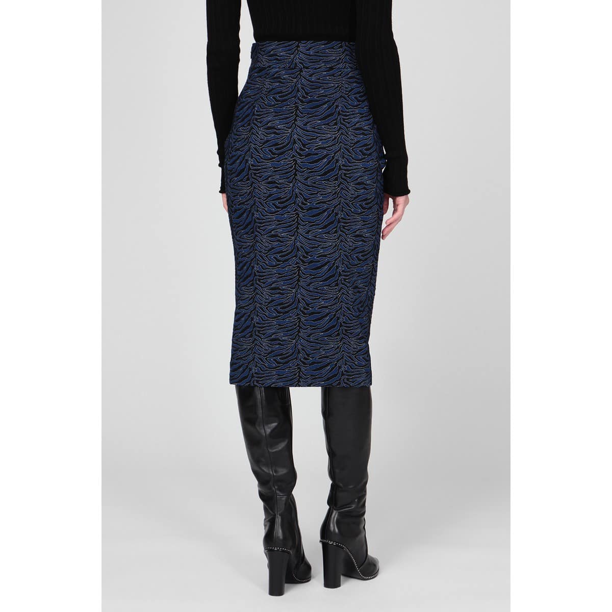 Midi rok van Pinko. Deze kokerrok is gemaakt van stretch stof met een zwart en blauw motief. De rok heeft een hoge taille, middellange lengte en sluit met een verborgen ritssluiting aan de zijkant.