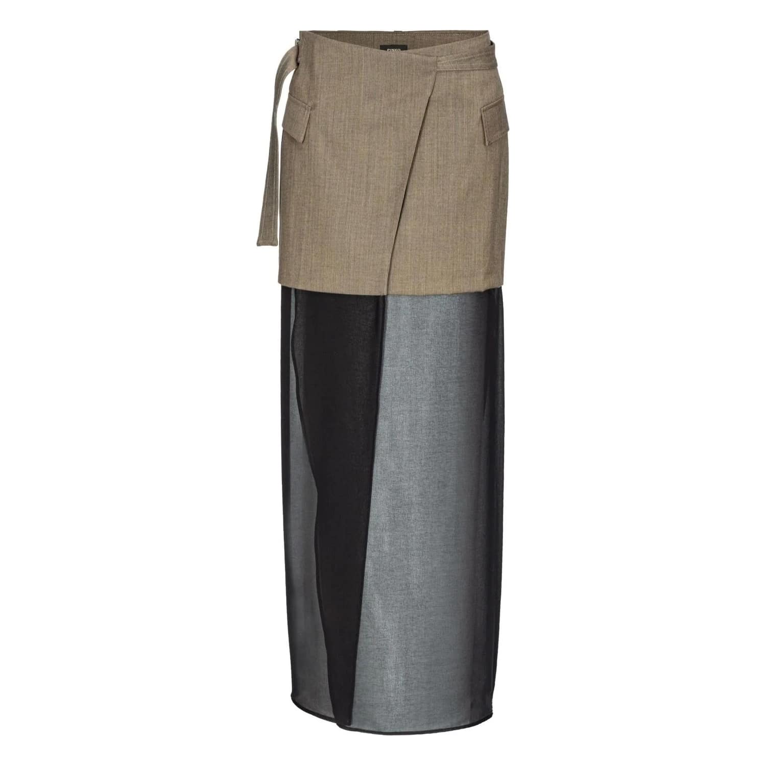 Midi rok van Pinko, model Illusione gonna in brown. De korte bruine rok is gemaakt van een wol met katoen mix en heeft daaronder een zwarte, doorschijnende midi rok. De overslag rok heeft een hoge taille, split aan de voorzijde en sluit met een ceintuur en knoopje aan de binnenzijde.
