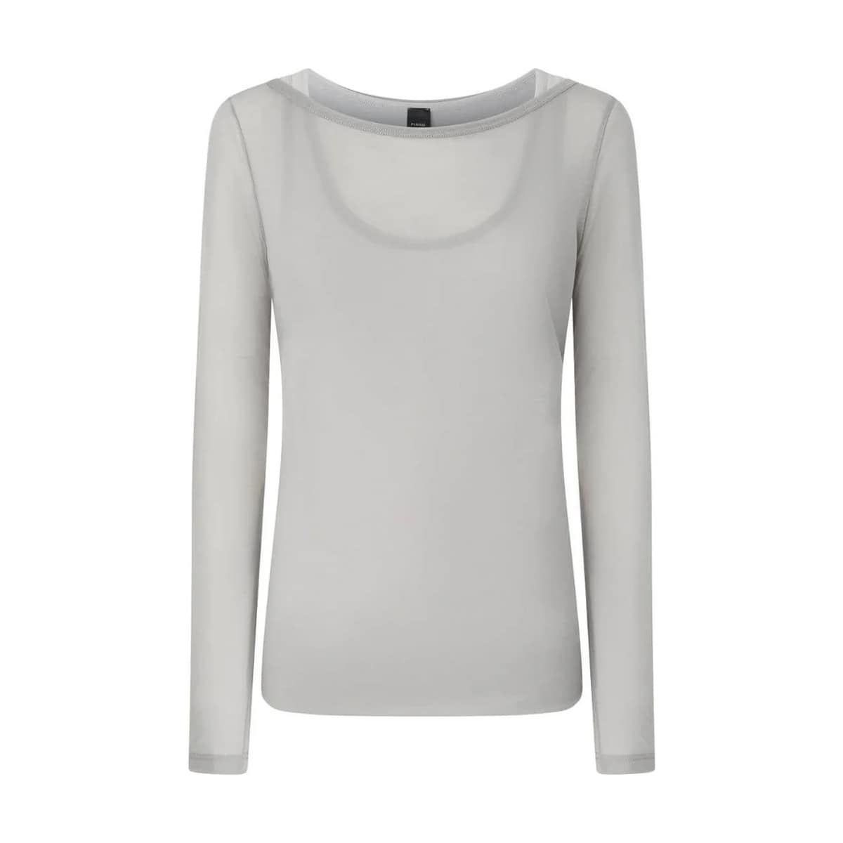 Grijze top van Pinko, model Merci sweater in grigio scuro. Deze dunne top bestaat uit een grijze tanktop met daaroverheen een doorschijnende grijze bovenlaag met een boothals. De top heeft een normale pasvorm en lange mouwen.