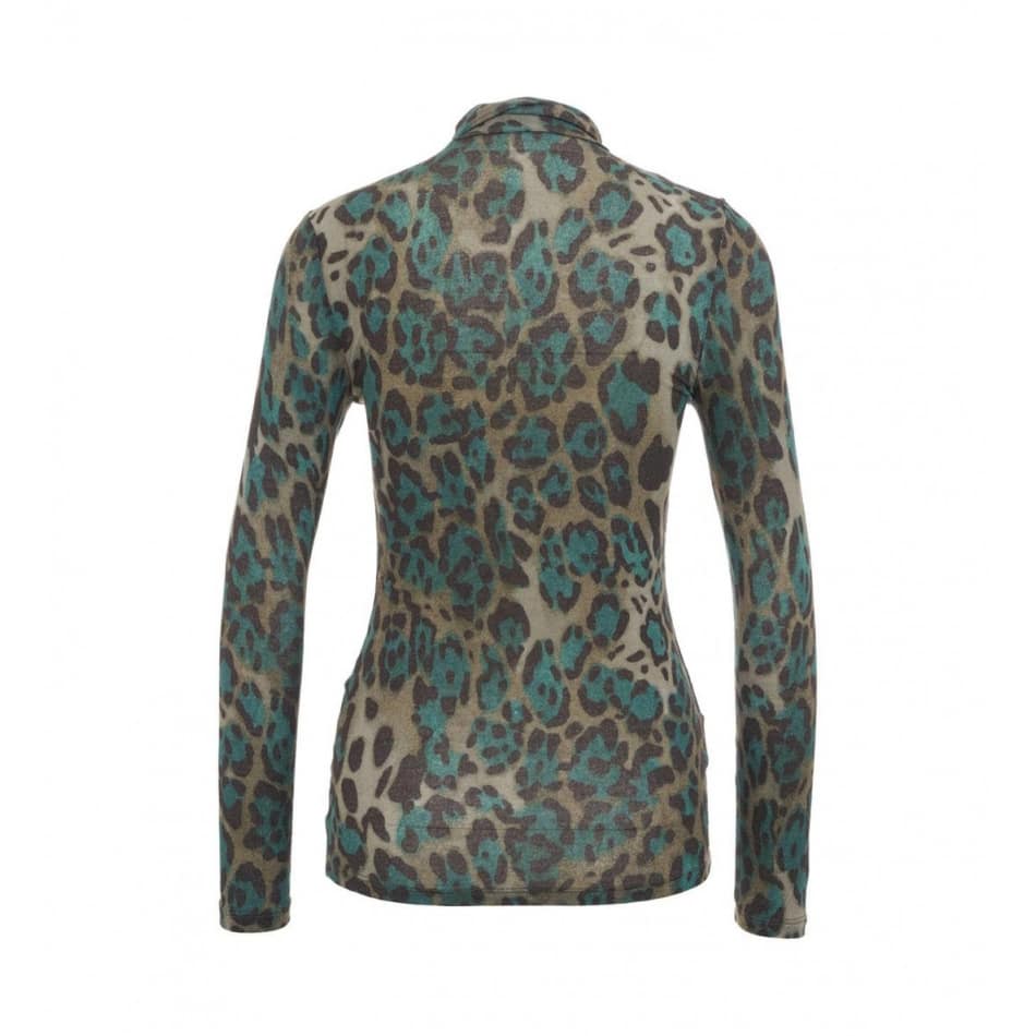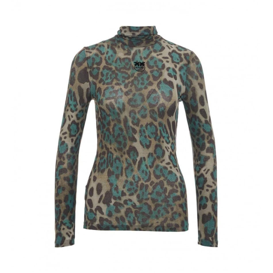 Aansluitende top van Pinko, model Abdaly. Deze dunne top heeft een bruine basis met een groene luipaard print en het Pinko Love Birds logo op de voorzijde. De top is gemaakt van een jersey stof en heeft een col.