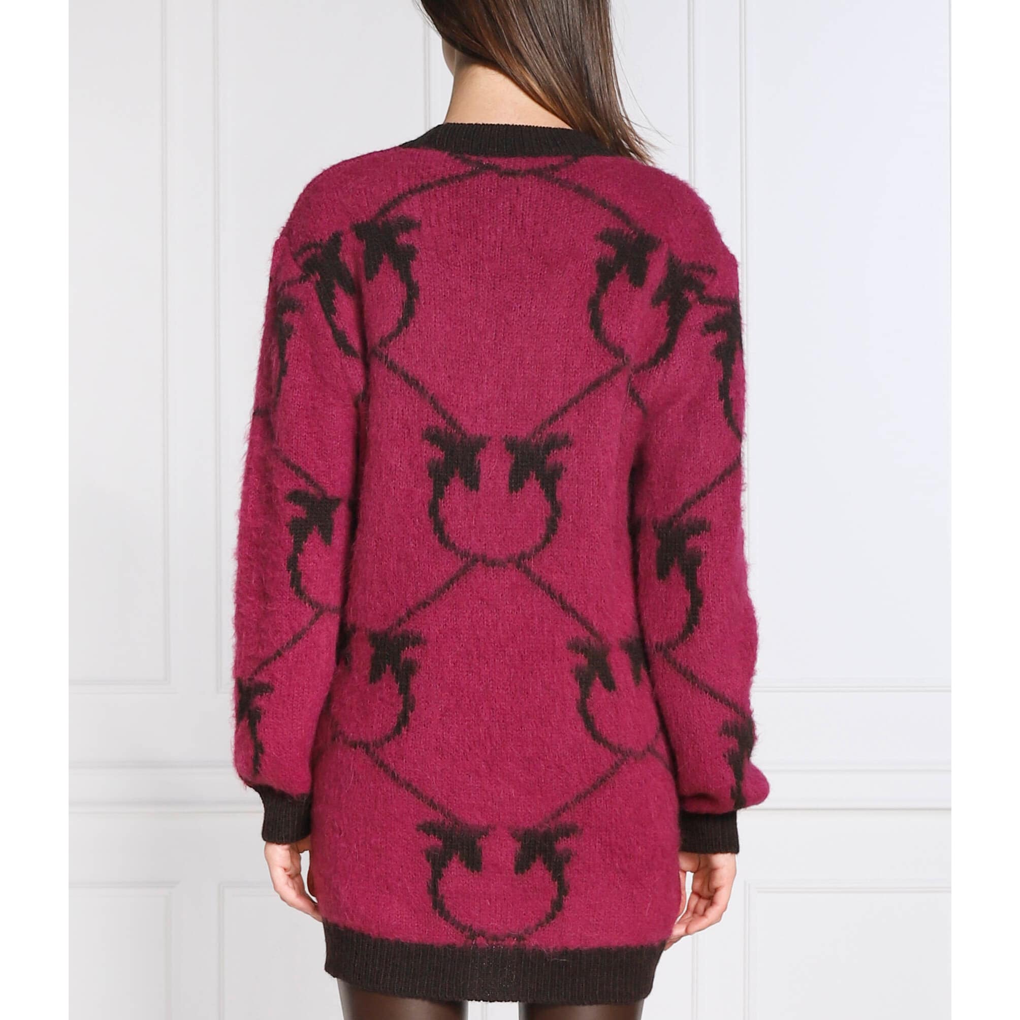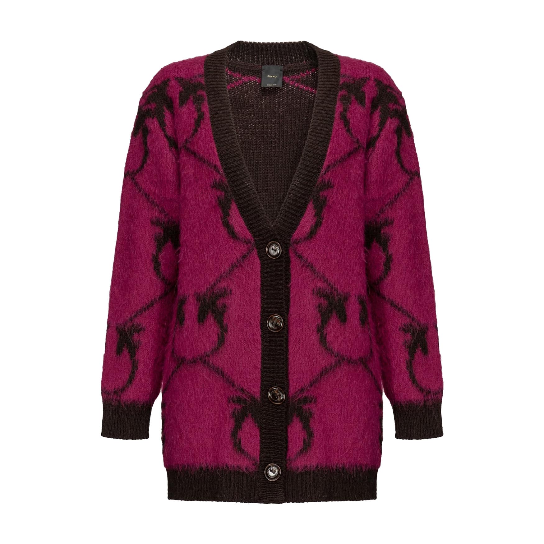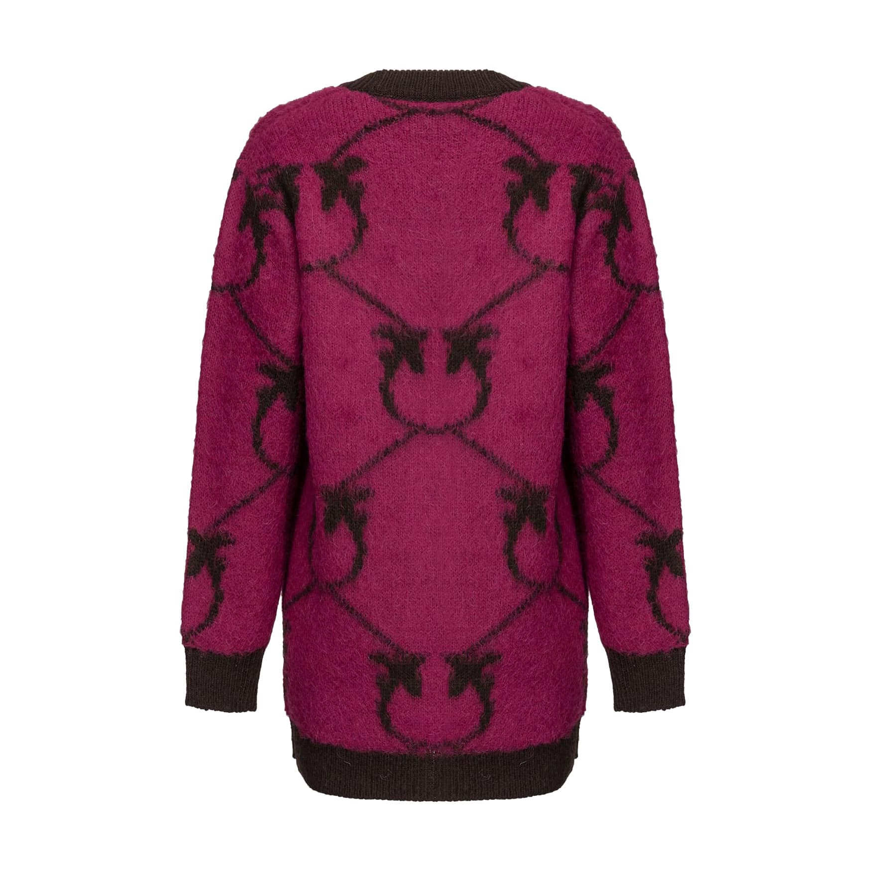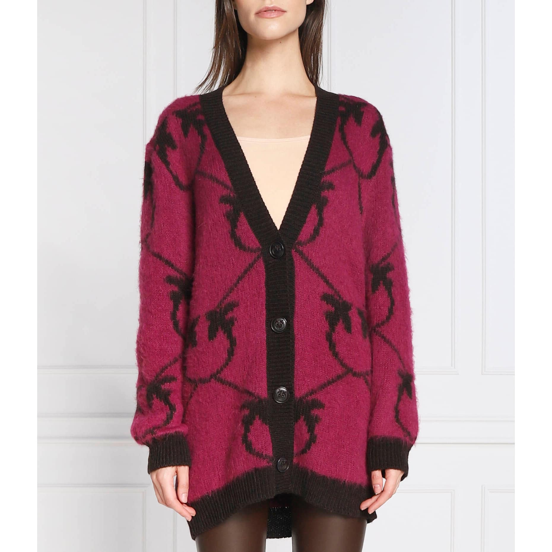 Lange wollen cardigan van Pinko, model cardigan Adelphi 4. Dit vest is gemaakt van een mix met alpaca wol en heeft een los vallende lange pasvorm. Het vest sluit aan de voorzijde met zwarte knopen, heeft een tekening met het kenmerkende Pinko love logo en een V-hals.