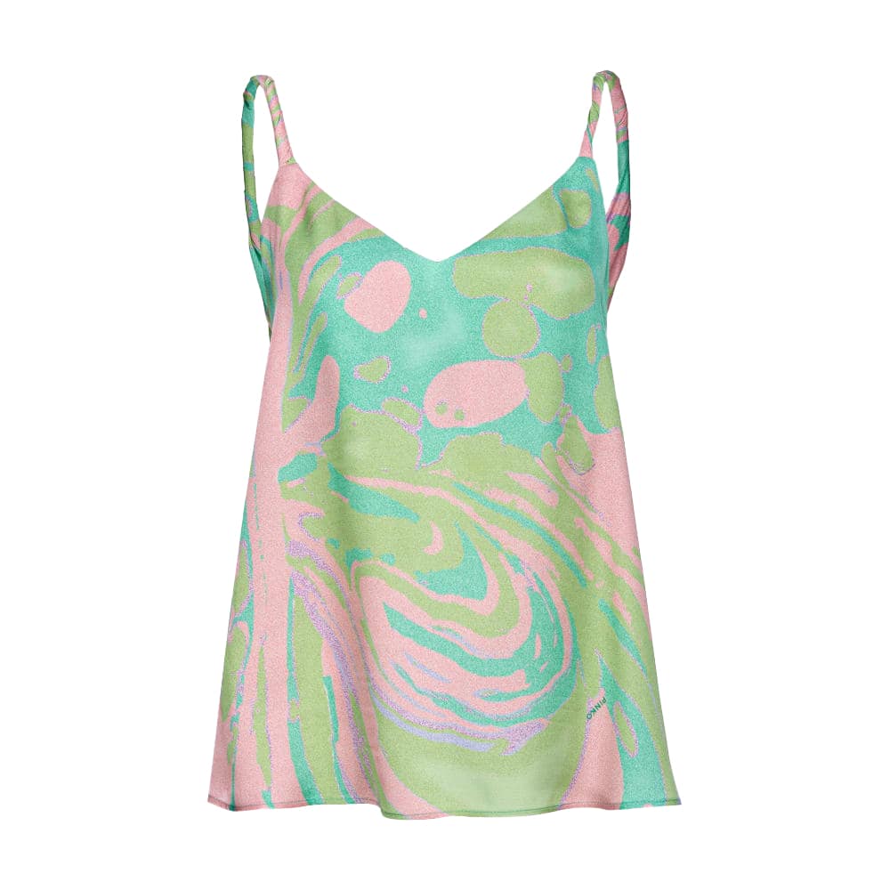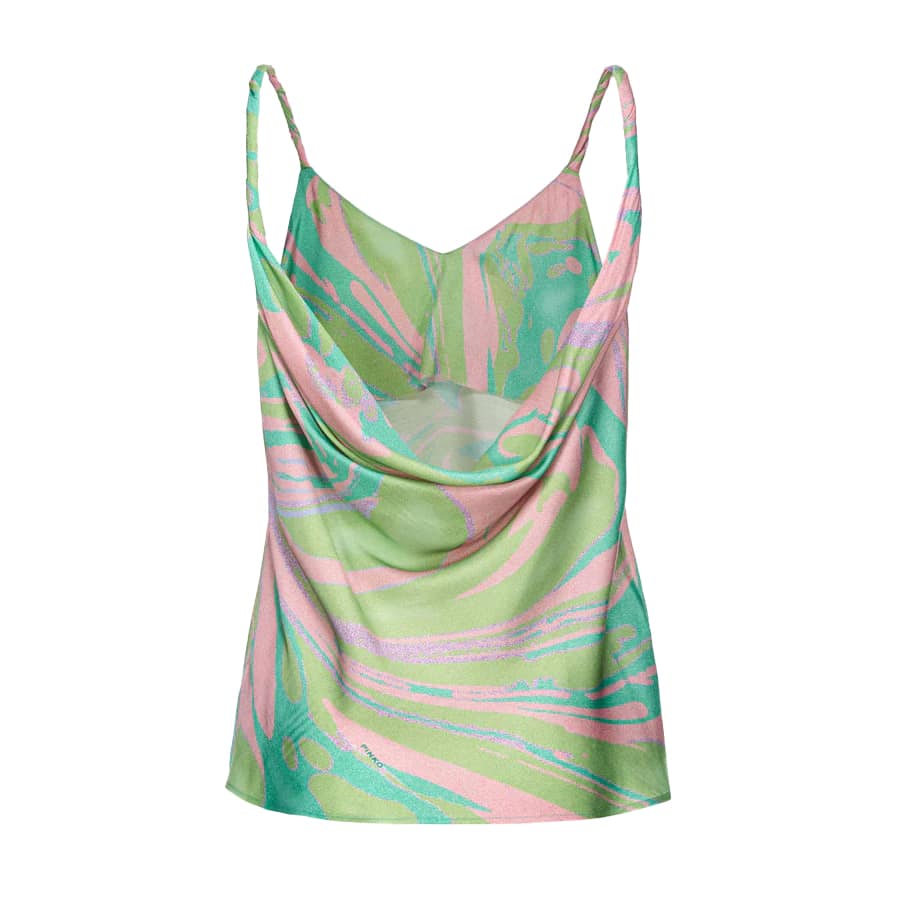Satijnen top van Pinko, model Talia top in satin stampa splash. Deze top is gemaakt van een groen roze stof en heeft een gedrapeerde achterzijde. De top heeft een V-hals en gedraaide schouderbandjes.