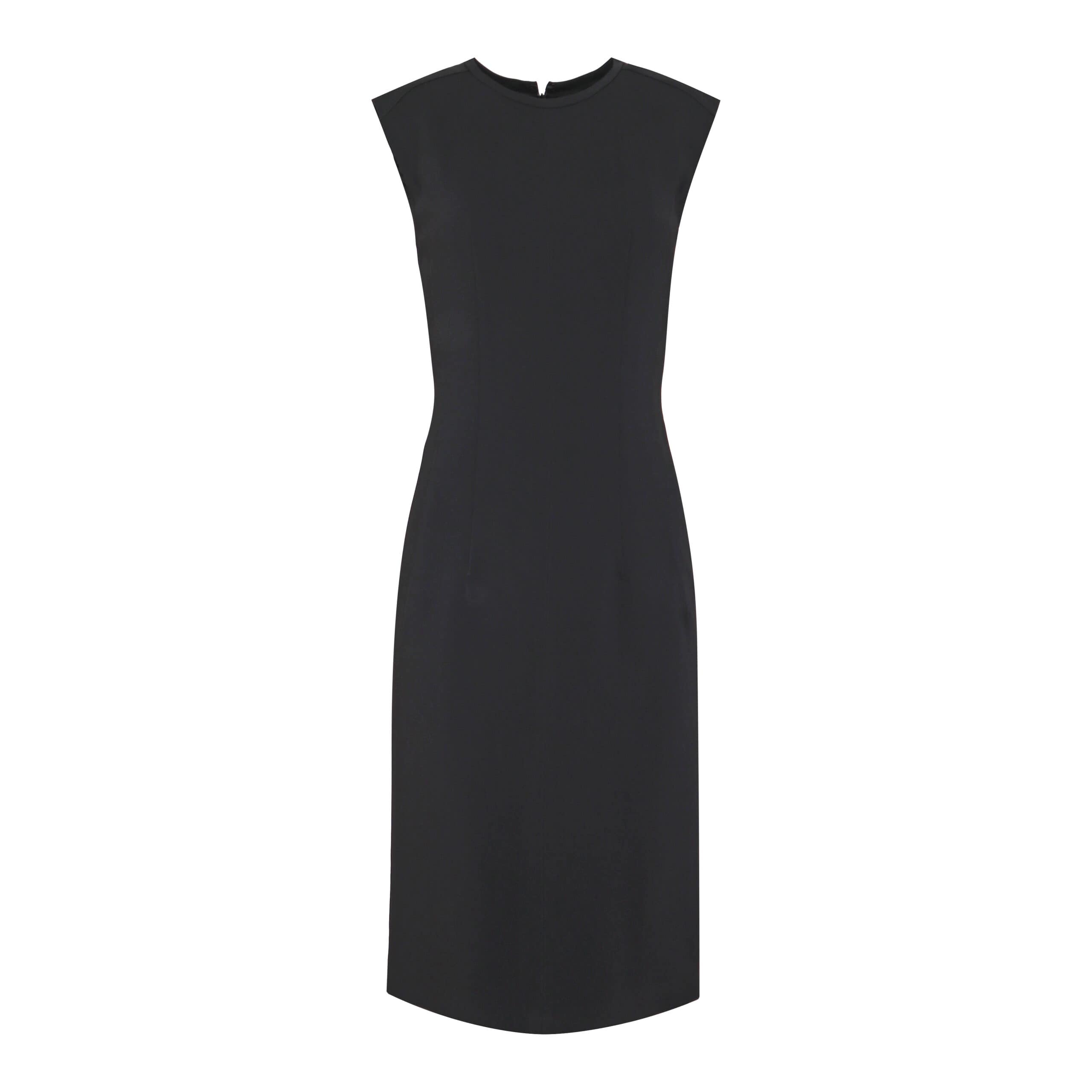 Zwart kleedje van Pinko, model Acquerello. Deze aansluitende jurk heeft een ronde hals en sluit aan de achterzijde met een verborgen ritssluiting. De belijnde jurk is gemaakt van zwarte stretch stof, heeft kleine schoudervullingen en valt onder de knie.