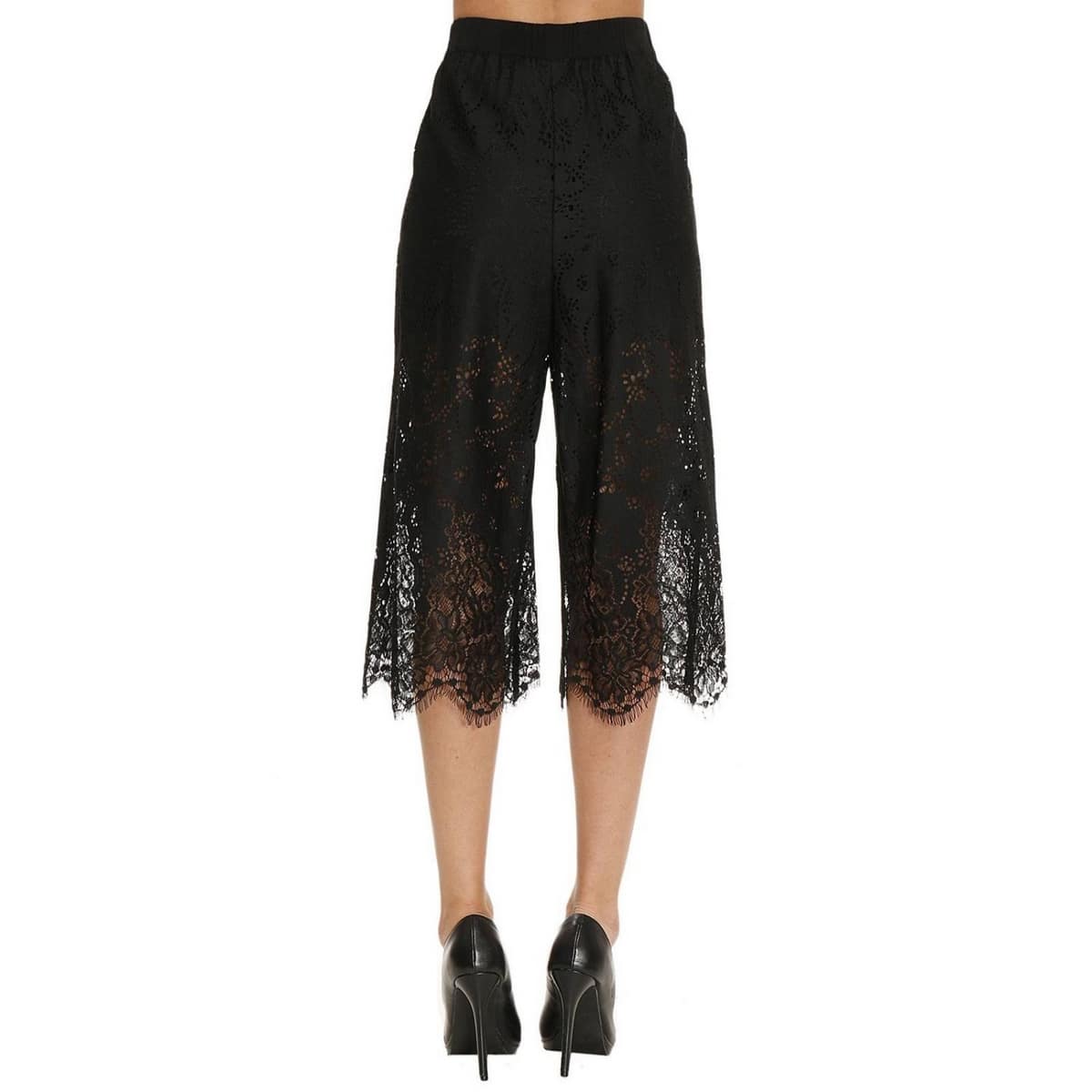Zwarte kanten pantalon van Pinko, model Fiducioso. Deze broek is gemaakt van een kanten stof en heeft een korte binnen broek. De pantalon heeft een elastische taille en valt tot onder de knie.
