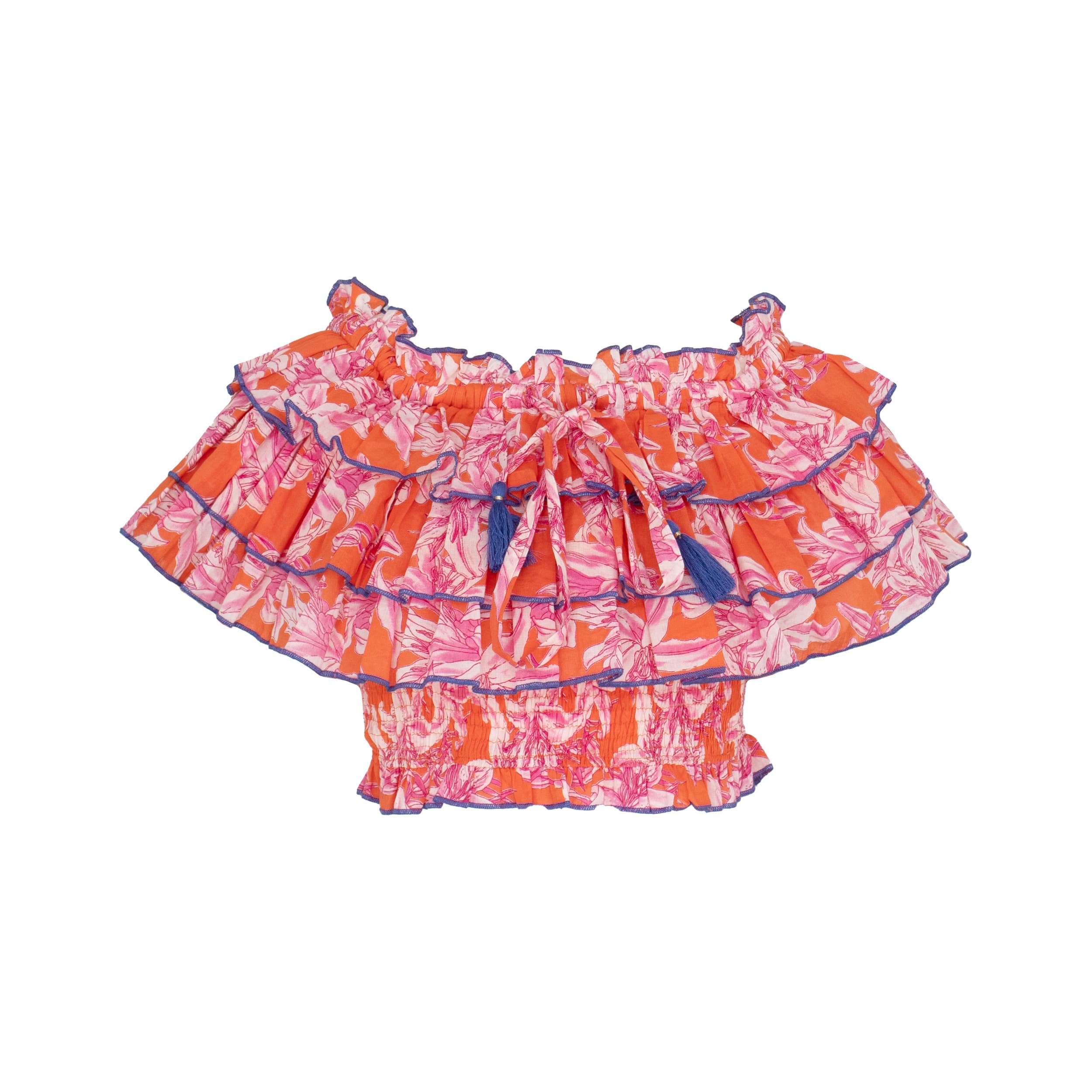 Cropped top van Place du Soleil. Deze top is gemaakt van katoen, heeft een roze met oranje bloemenprint die afgewerkt is met een blauwe zoom en heeft een gesmockte body die tot de taille valt. Bij de schouders heeft de top drie lagen ruches met een elastische halslijn en sierlijk trekkoord, zodat je deze top ook off shoulder kunt dragen.