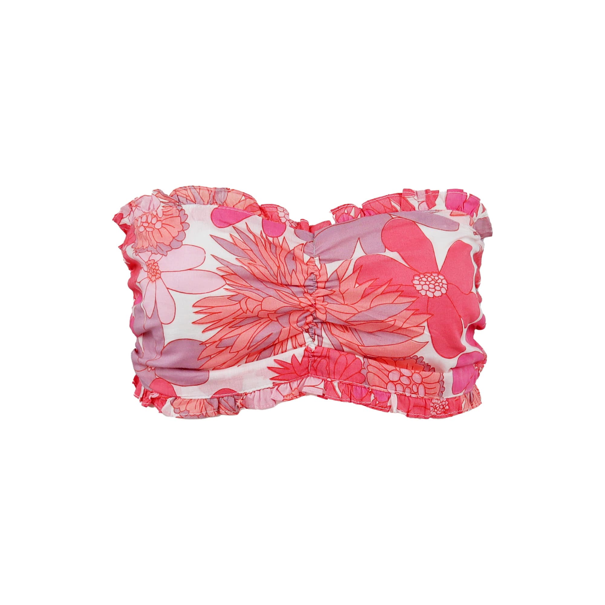 Roze bustier van Place du Soleil. Deze bustier is gemaakt van katoen en heeft een roze bloemenprint. De achterzijde is gesmockt elastisch.