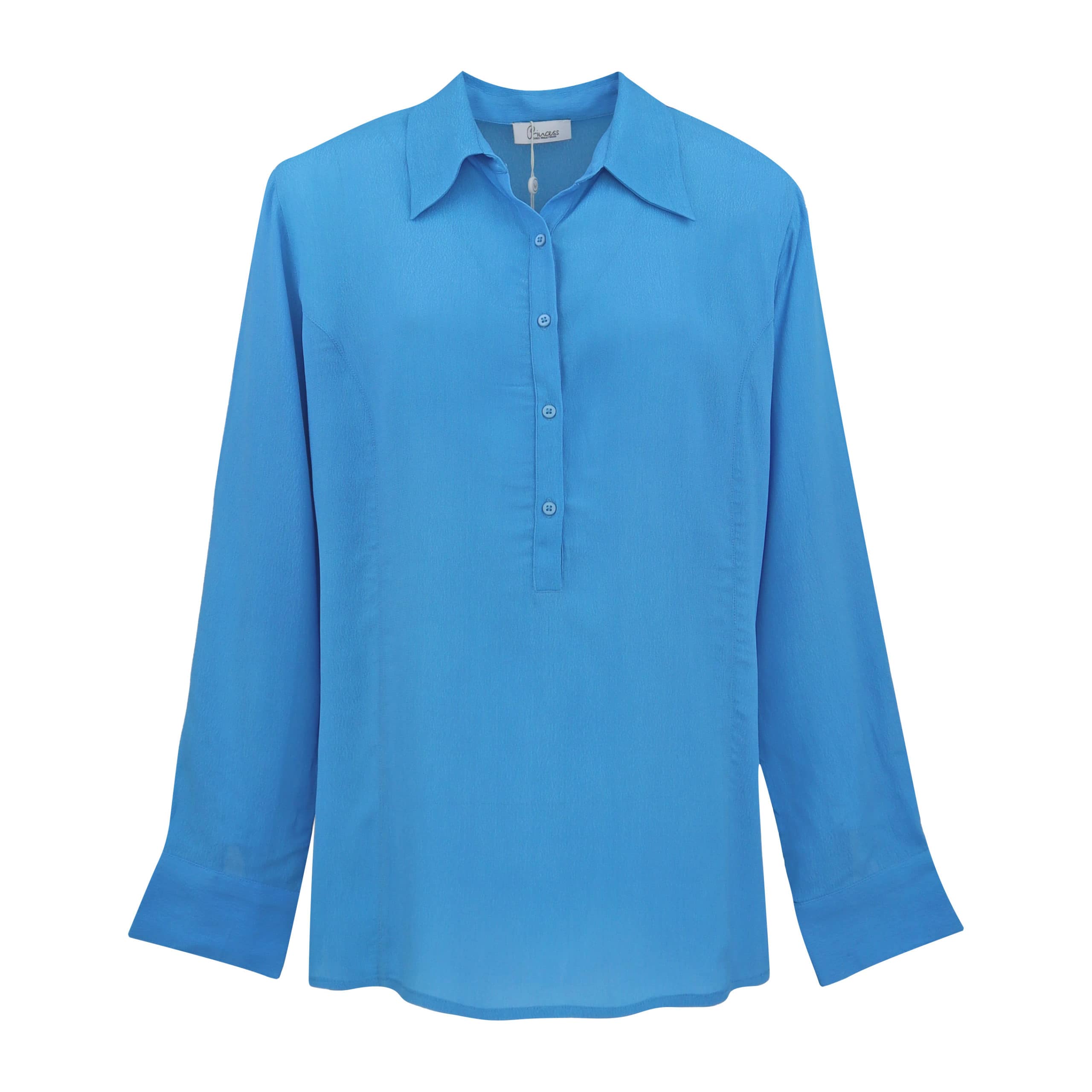 Los vallende blouse van Princess goes Hollywood, model tight basic blouse in vived blue. Deze blouse heeft een effen blauwe kleur en een rechte pasvorm. De blouse heeft een klassieke kraag en knoopjes aan de voorzijde die tot halverwege de blouse lopen.