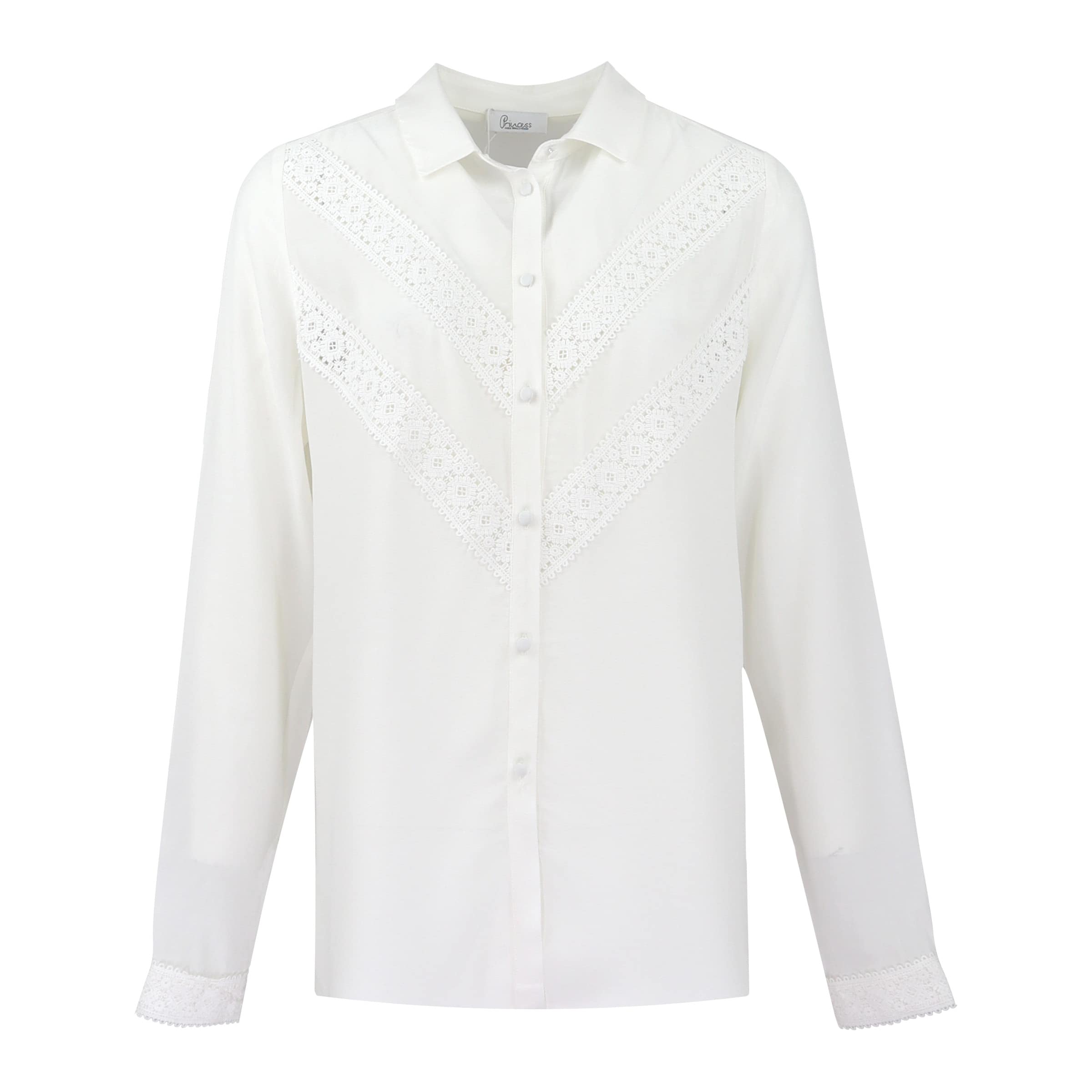 Off white blouse van Princess goes Hollywood, model basic lace blouse. Deze blouse heeft aan de voorzijde diagonaal twee stroken kant met kanten manchetten en is licht doorschijnend. De blouse heeft een losse pasvorm en sluit met kleine ronde knoopjes aan de voorzijde.