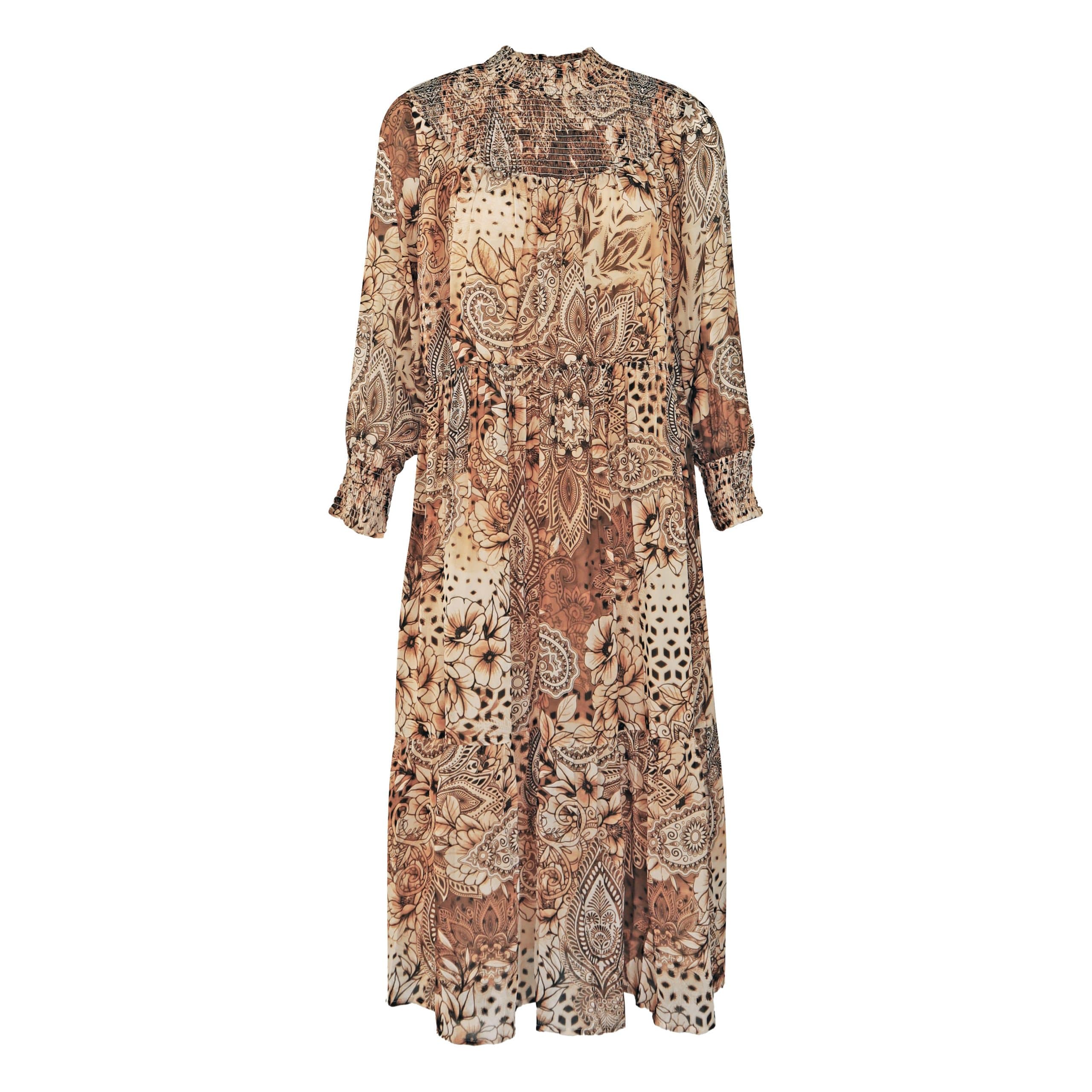 Bruin paisley kleedje van Princess goes Hollywood, model paisley mandala dress in paisley mandala print. Deze midi jurk valt op de kuiten, is gevoerd en gemaakt van een bruine paisley print viscose stof. De jurk heeft smocked schouders en manchettes, een elastische taille, lange mouwen en een los vallende pasvorm.