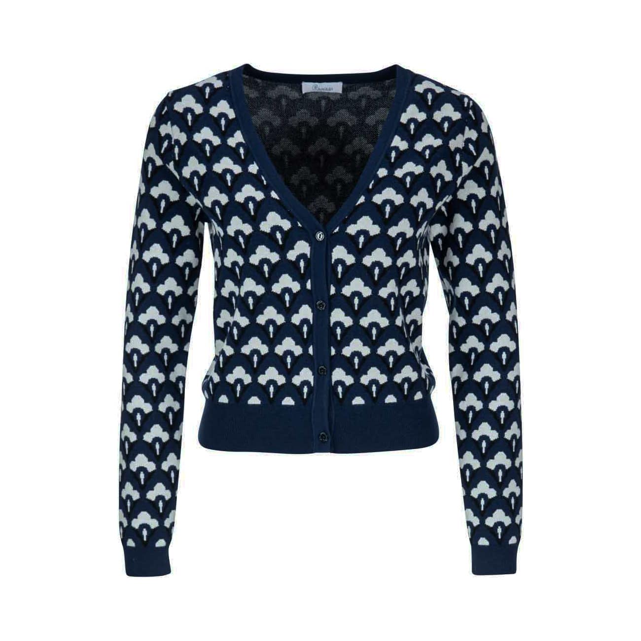 Fijn gebreid vest van Princess goes Hollywood. Deze cardigan sluit aan de voorzijde met kleine knoopjes en valt kort. Het vest heeft een donkerblauw met zwart en witte tekening, een jacquard patroon, lange mouwen en een V-hals.