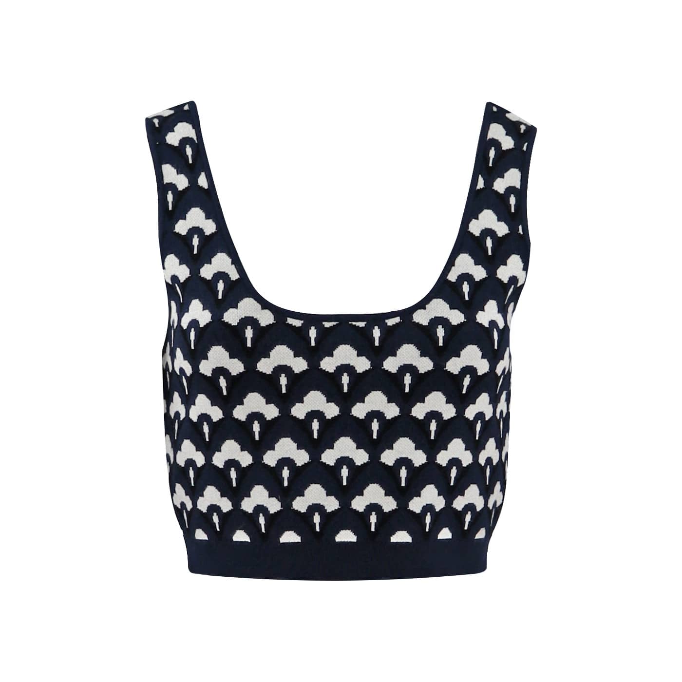 Fijn gebreide top van Princess goes Hollywood. Deze top valt kort en heeft een  donkerblauwe met witte tekening. De top is gemaakt van een stretch stof en heeft een aansluitende pasvorm.