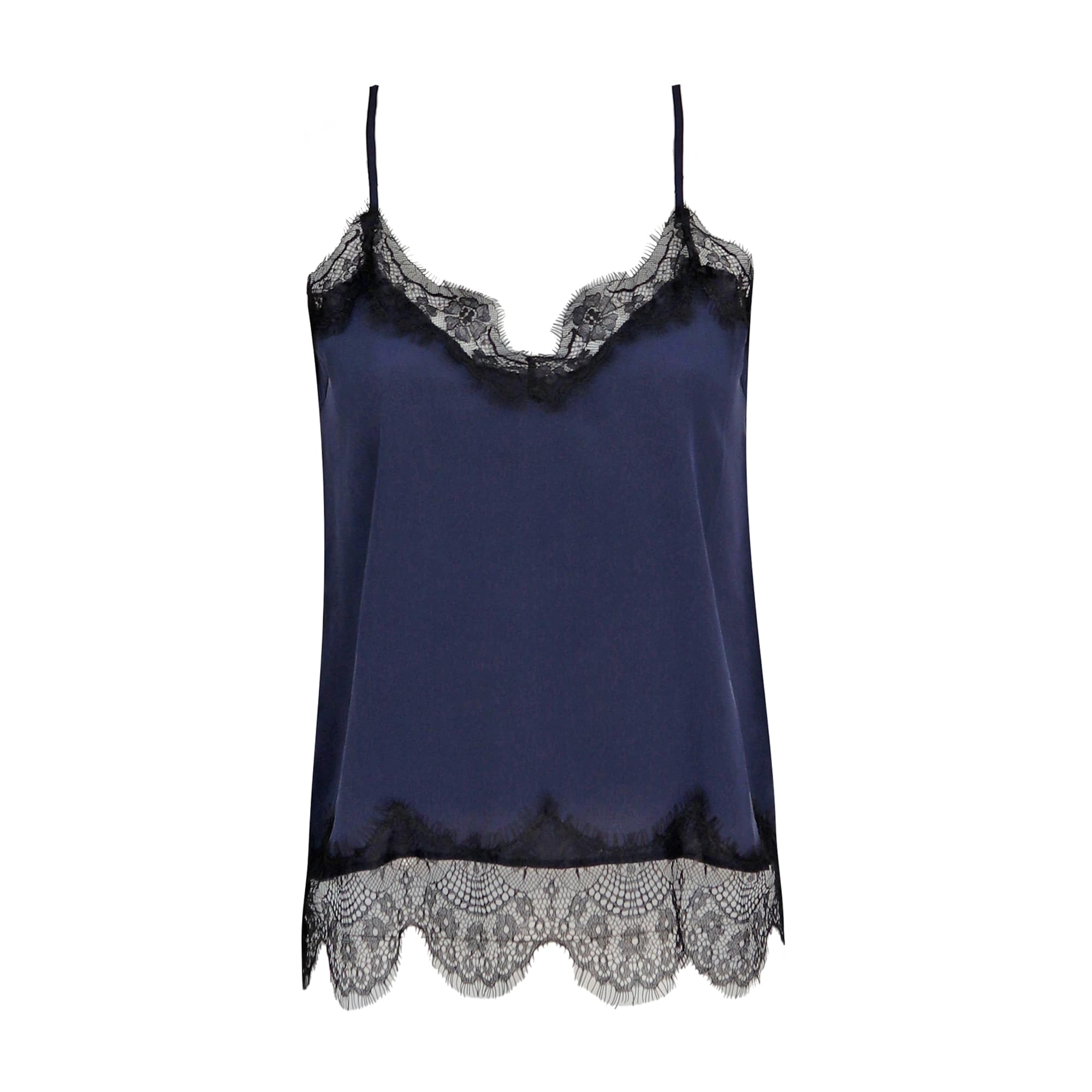 Donkerblauwe top van Princess goes Hollywood. Deze top is gemaakt van 100% zijde die is afgewerkt met zwarte stroken kant. De spaghetti bandjes van de top zijn verstelbaar.