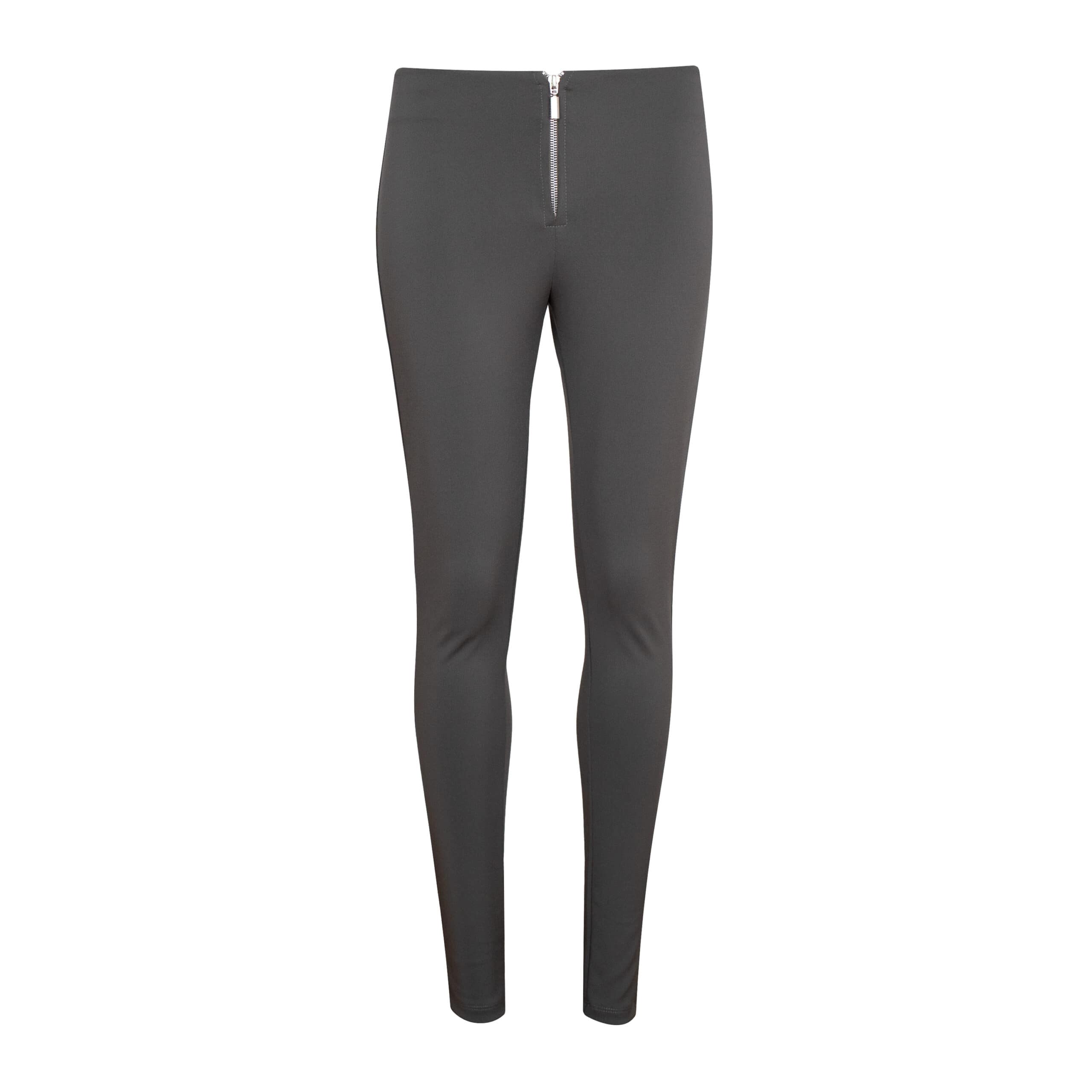 Donkergrijze legging Princess goes Hollywood, model tight leggings in metal sky. Deze legging is gemaakt van een gladde stretch stof en heeft een aansluitende pasvorm. De broek heeft een elastische taille en sluit aan de voorzijde met een zichtbare rits.