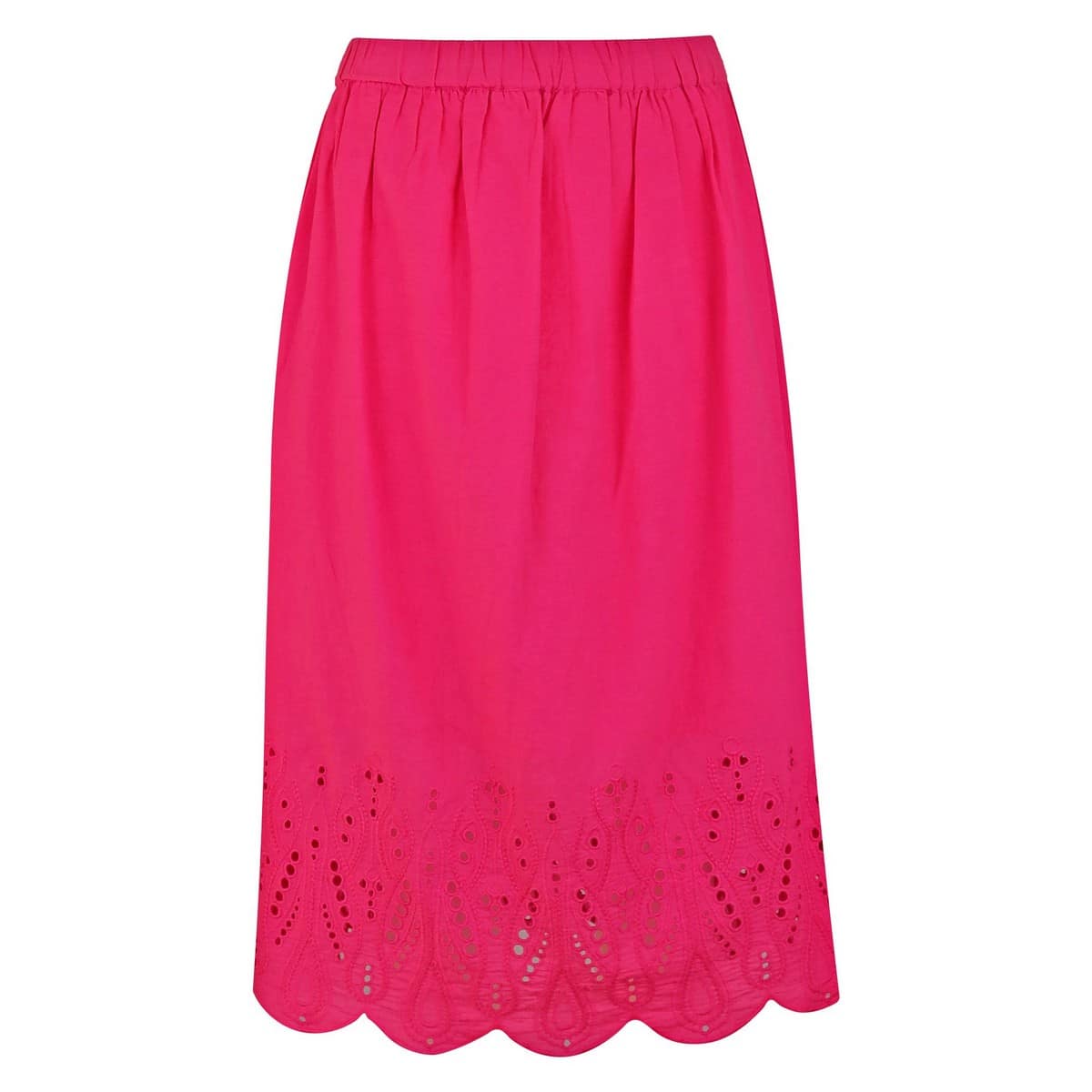 Midi rok van Princess goes Hollywood. Deze fuchsia rok heeft een elastische taille en een met broderie afgewerkte zoom. De rok heeft een uitlopende pasvorm en valt tot over de knie.