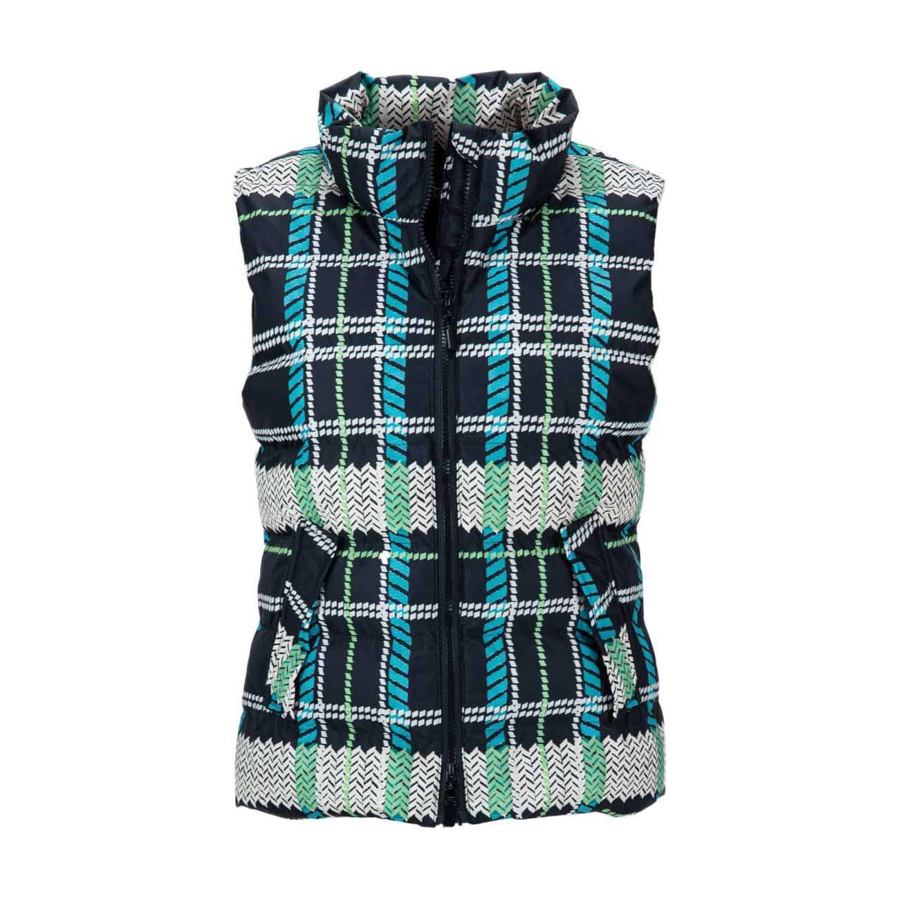 Bodywarmer van Princess goes Hollywood. Deze bodywarmer heeft een zwarte basis met een blauw, groen met wtte print. De bodywarmer heeft twee steekzakken en sluit met een ritssluiting.