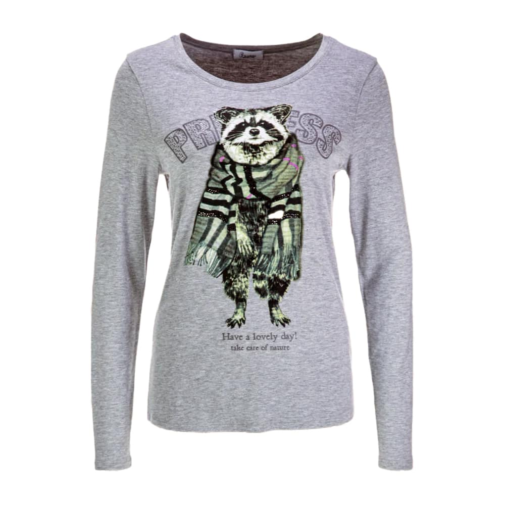 Grijs t-shirt van Princess goes Hollywood, model long-sleeved shirt with raccoon motief in castor grey. Dit t-shirt heeft een normale pasvorm, ronde hals en lange mouwen. Het t-shirt is gemaakt van een grijze stretch stof, heeft aan de voorzijde een afbeelding van een wasbeer met de tekst princess have a lovely day! en is bezet met strass steentjes.