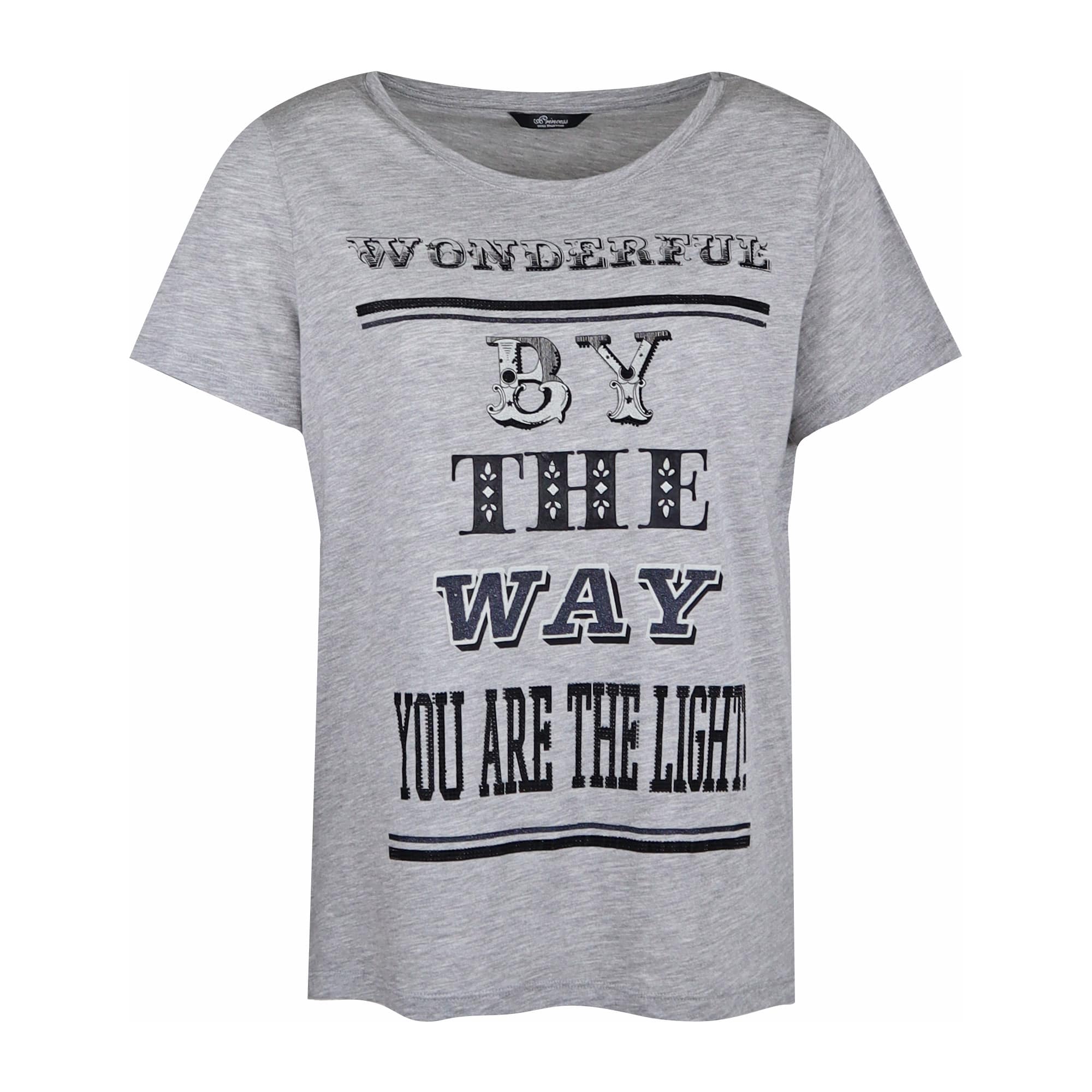 Grijs t-shirt van Princess goes Hollywood. Dit t-shirt heeft een normale pasvorm, ronde hals en korte mouwen. Op de voorzijde staan de woorden wonderfull by the way you are the light!. Sommige woorden zijn versiert met zwarte steentjes. Het shirt is gemaakt van een mix van katoen en modal, waardoor het extra zacht aanvoelt en fijn draagt.