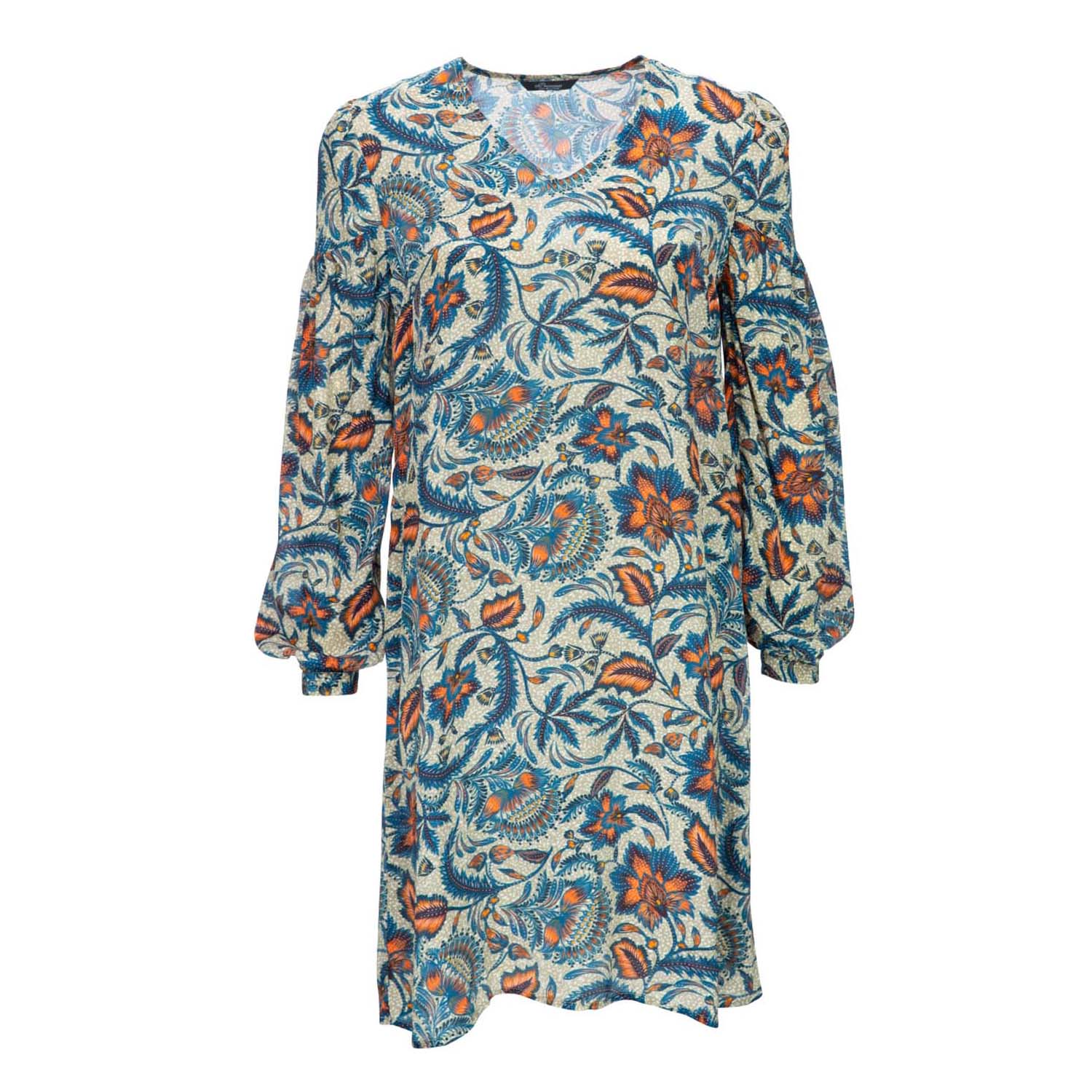 Losvallend kleedje van Princess goes Hollywood. Deze jurk is gemaakt van een dunne viscose stof en heeft een beige met creme basis met oranje, blauwe paisley bloemen. De jurk heeft een V-hals, ballon mouwen en valt boven de knie.