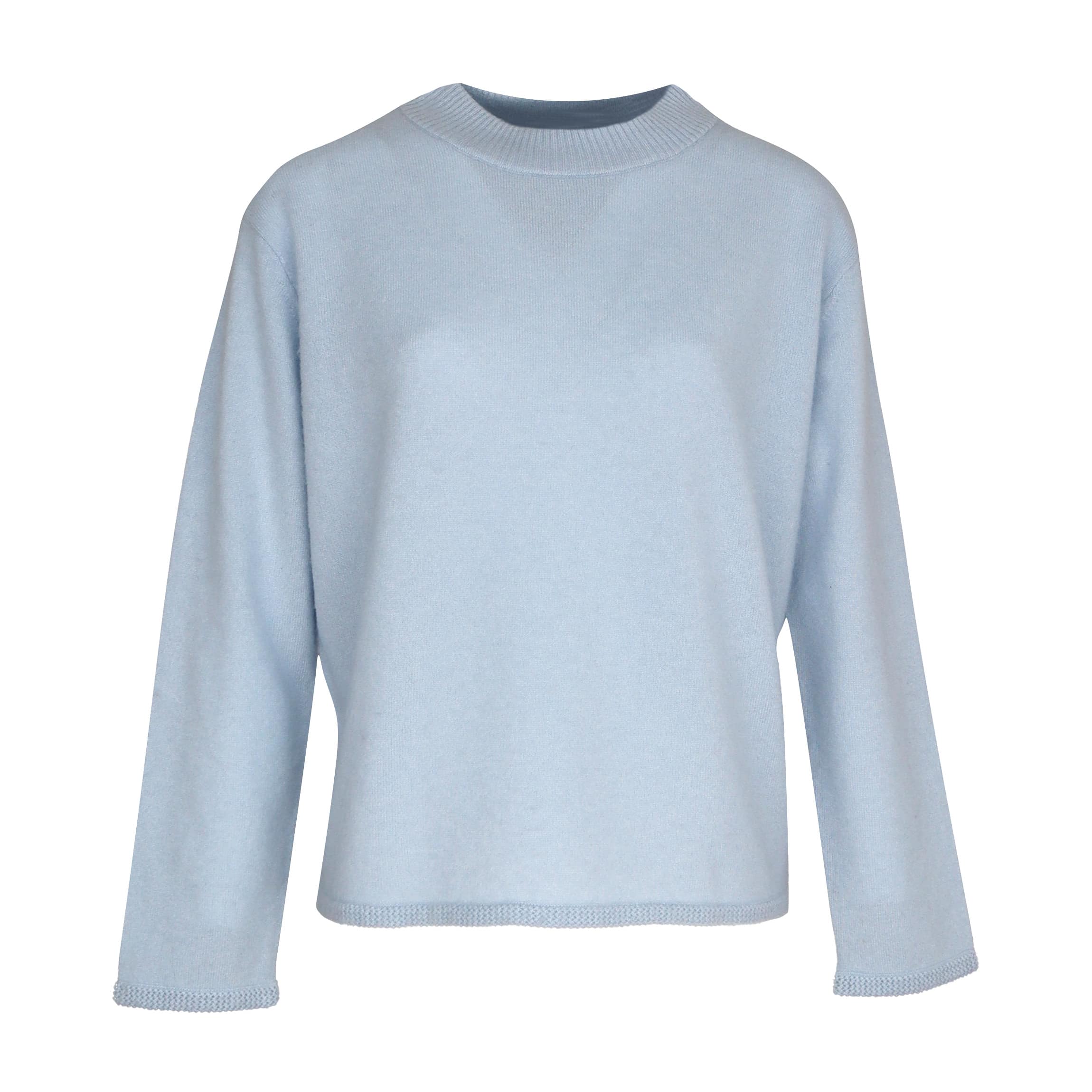 Lichtblauwe pull van Princess goes Hollywood, model basic RN brushed cashmere in skyway. Deze kasjmier trui is fijn gebreid, heeft een ronde hals en lange mouwen. De trui voelt heerlijk zacht, valt losjes en heeft geribbelde manchetten en zoom.