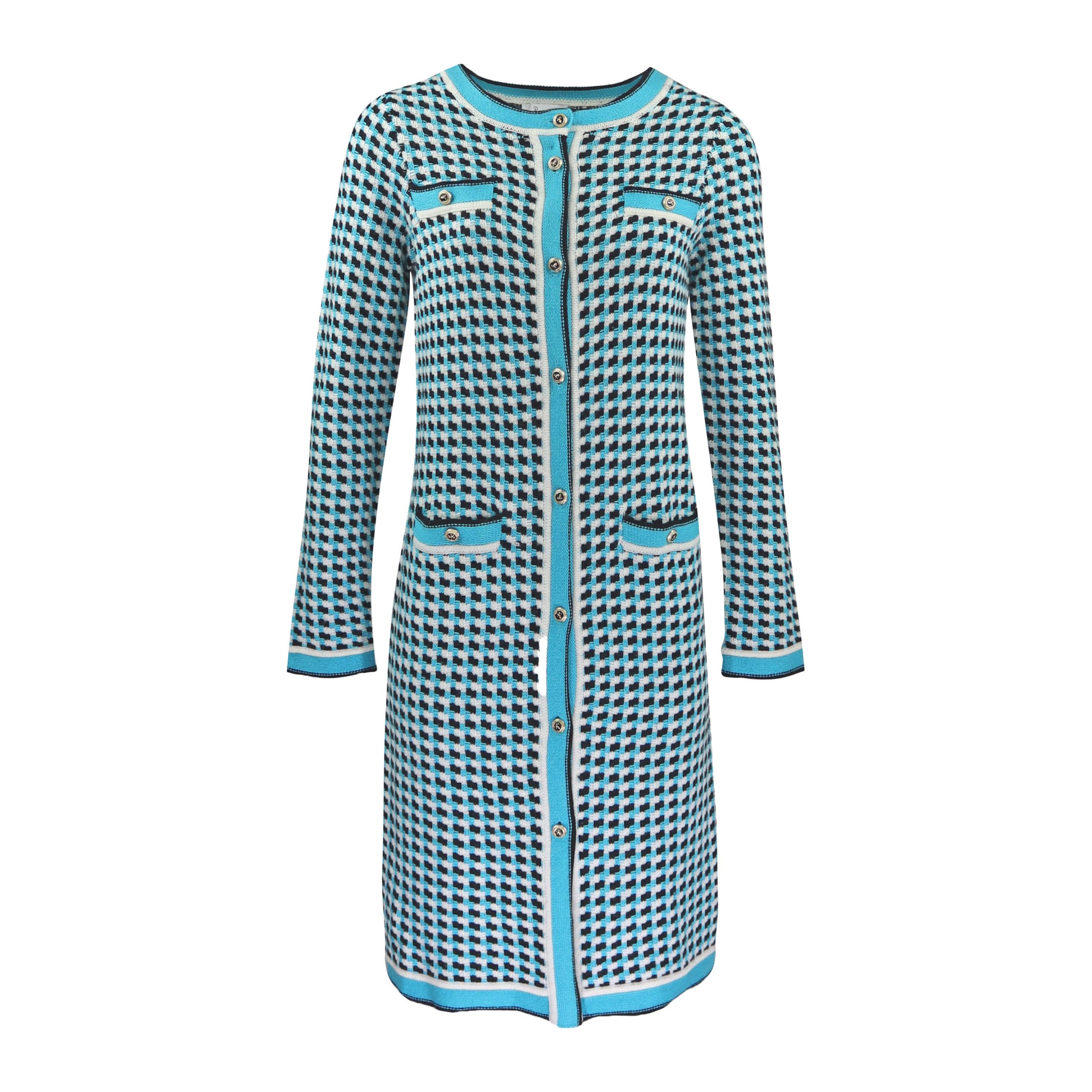 Lange cardigan van Princess goes Hollywood. Dit lange gebreide vest is gemaakt van een wol mix met kasjmier en heeft een blauw, zwart, witte tekening. Het vest sluit aan de voorzijde met kleine knoopjes, heeft twee steekzakken en een aansluitende pasvorm.