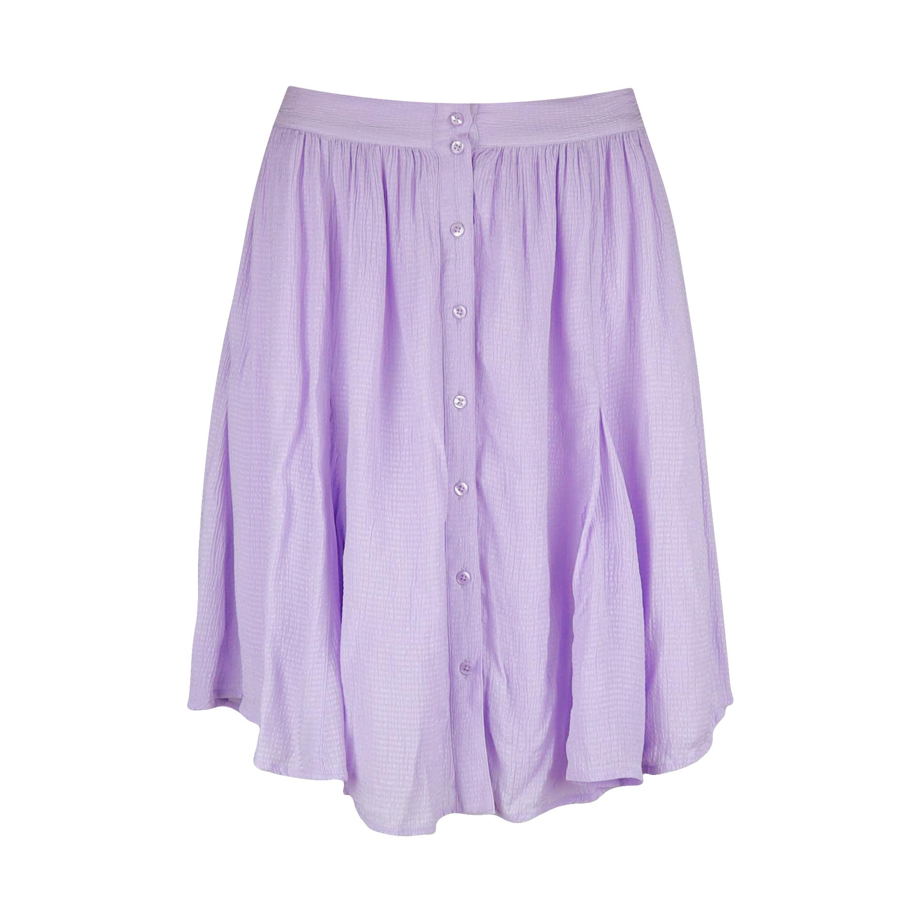 Lila rok van Princess goes Hollywood. Deze rok is gevoerd, heeft een bovenlaag met reliëf en hogere taille. De rok sluit aan de voorzijde met knoopjes, heeft aan de achterzijde een elastische taille, uitlopende pasvorm en valt tot boven de knie.