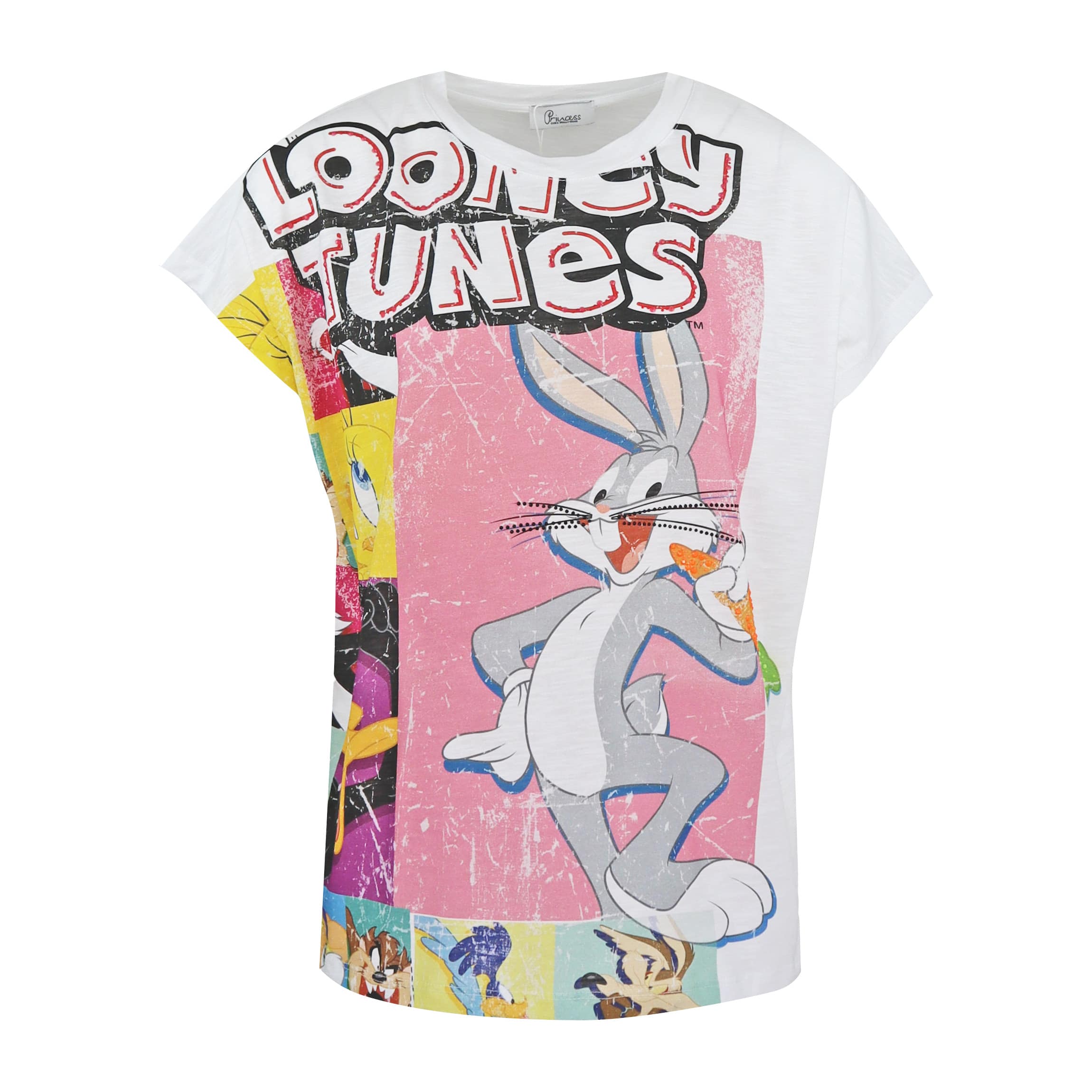 Looney Tunes t-shirt van Princess goes Hollywood, model shirt with Looney Tunes print in clear white. Dit katoenen t-shirt heeft een los vallende pasvorm en kapmouwen. Het t-shirt heeft aan de voorzijde een afbeelding van Bugs Bunny met patches van de andere figuren en de letters Looney Tunes. De letters zijn bezet met rode steentjes en Bugs Bunny’s wortel en snorharen zijn bezet met steentjes.