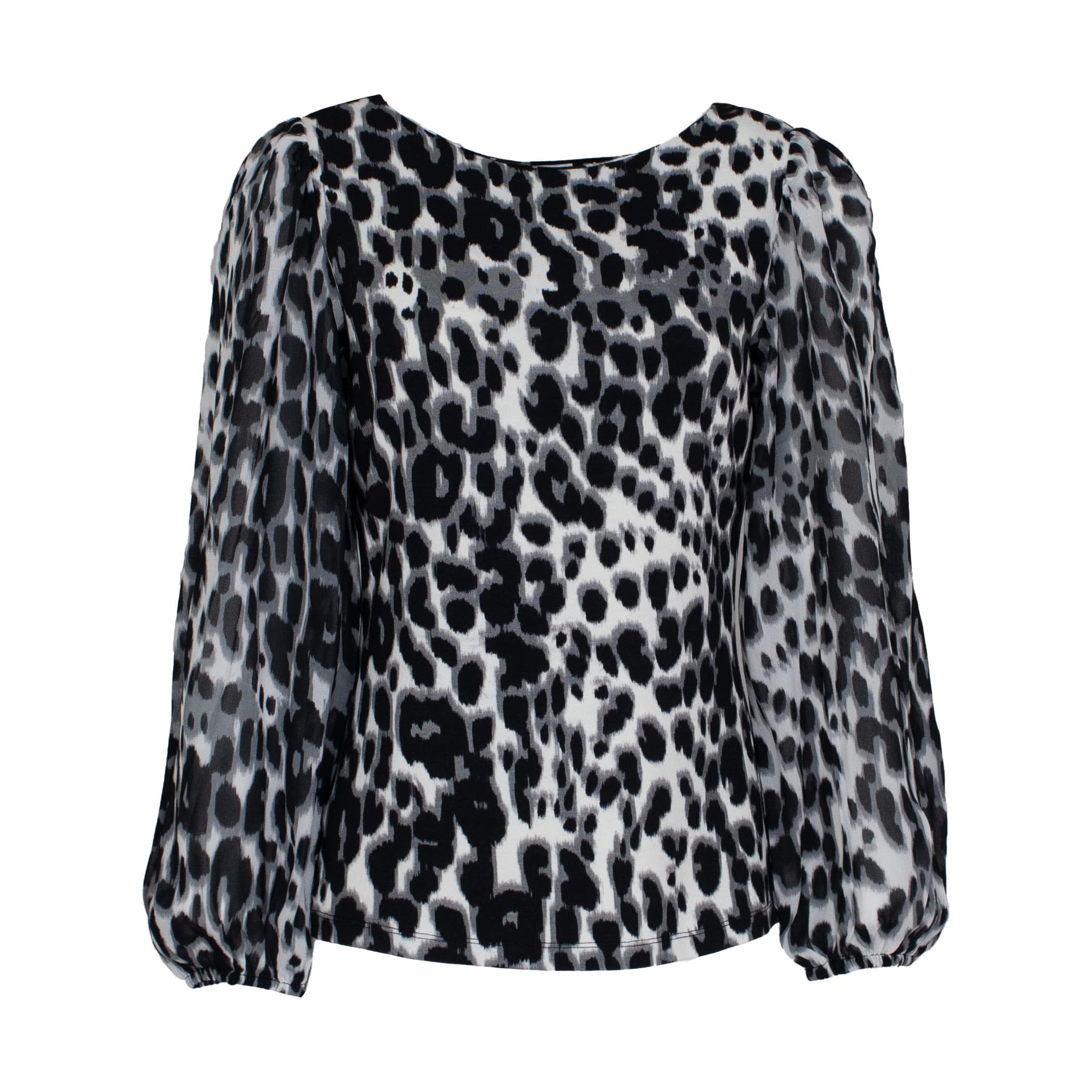 Luipaard shirt van Princess goes Hollywood, model jersey leo blouse in black white leo. Deze blouse is gemaakt van een body die aanvoelt als een t-shirt stof en heeft licht doorschijnende mouwen met elastische manchetten. Het shirt heeft een normale pasvorm, ronde hals en lange, wijde pofmouwen.