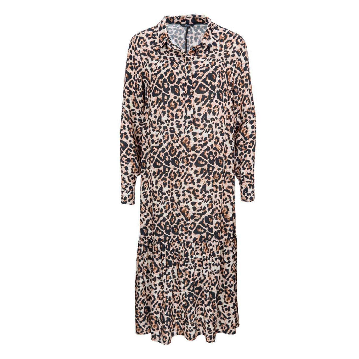 Midi kleedje van Princess goes Hollywood. Deze blouse jurk heeft een all-over luipaard print en sluit met een verborgen knoopsluiting aan de voorzijde. De jurk heeft een losse pasvorm, lange mouwen en valt op de kuiten.