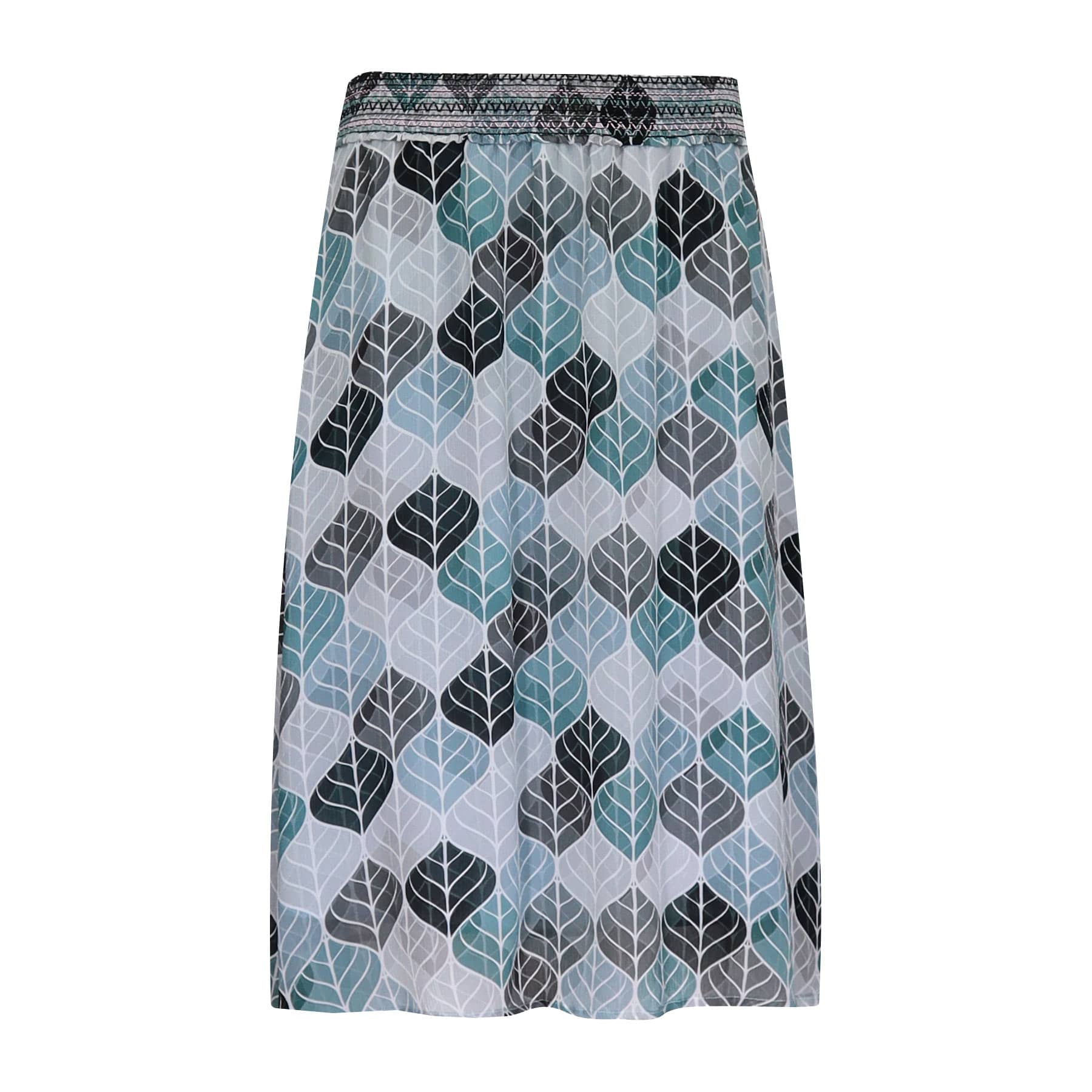 Midi rok van Princess goes Hollywood, model smockes waist skirt in freezing leaves. Deze rok heeft een grijs blauwe onderrok met hierover heen een laag met een print van blaadjes in diverse blauw grijze tinten. De rok heeft een gesmockte elastische taille en valt onder de knie.