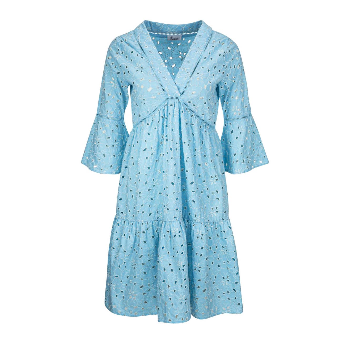 Lichtblauwe broderie kleedje van Princess goes Hollywood. Deze katoenen jurk is opengewerkt met geborduurde bloemen en heeft een strookje aan de hals, mouwen en borst. De jurk heeft een losvallende pasvorm, verhoogde taille met aan de onderzijde een zwierige volant.
