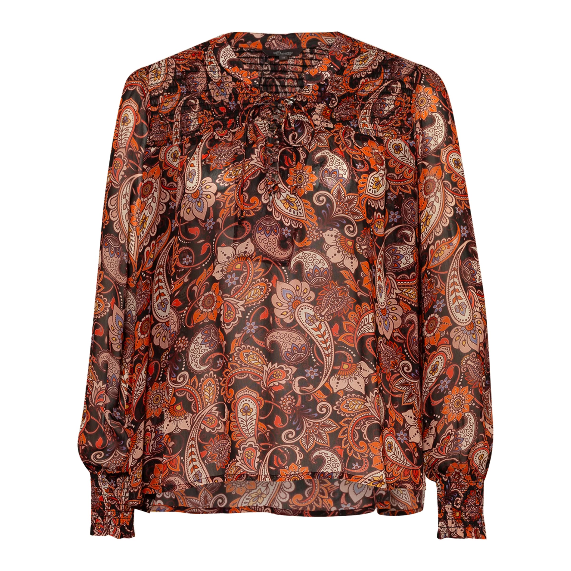 Blouse van Princess goes Hollywood. Deze losvallende blouse heeft een all-over paisley print in oranje en bruin. De blouse kun je aan de voorzijde met koordjes dicht rijgen. De schouders en manchetten zijn elastisch gesmockt.