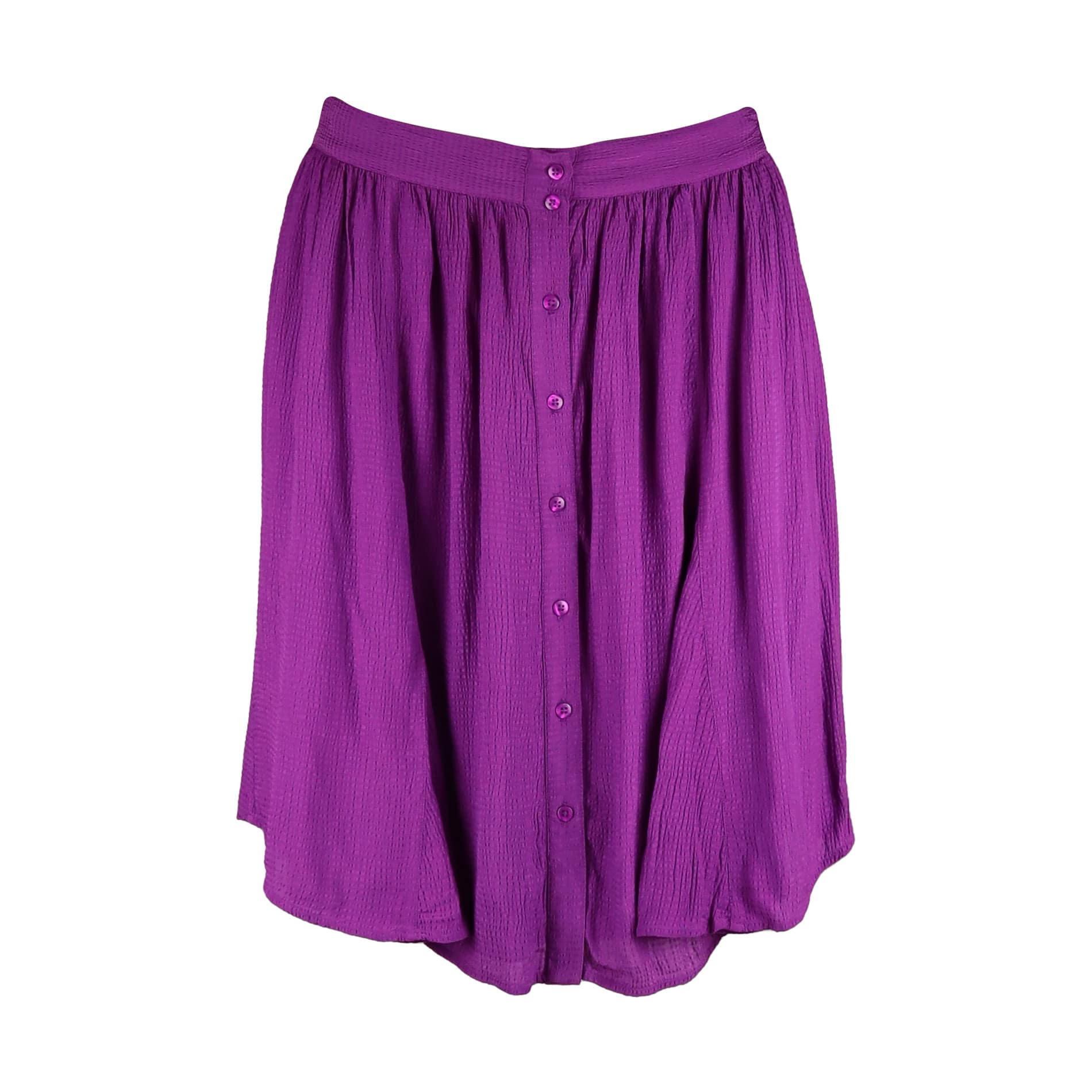 Paarse rok van Princess goes Hollywood. Deze rok is gevoerd, heeft een bovenlaag met reliëf en hogere taille. De rok sluit aan de voorzijde met knoopjes, heeft aan de achterzijde een elastische taille, uitlopende pasvorm en valt tot boven de knie.
