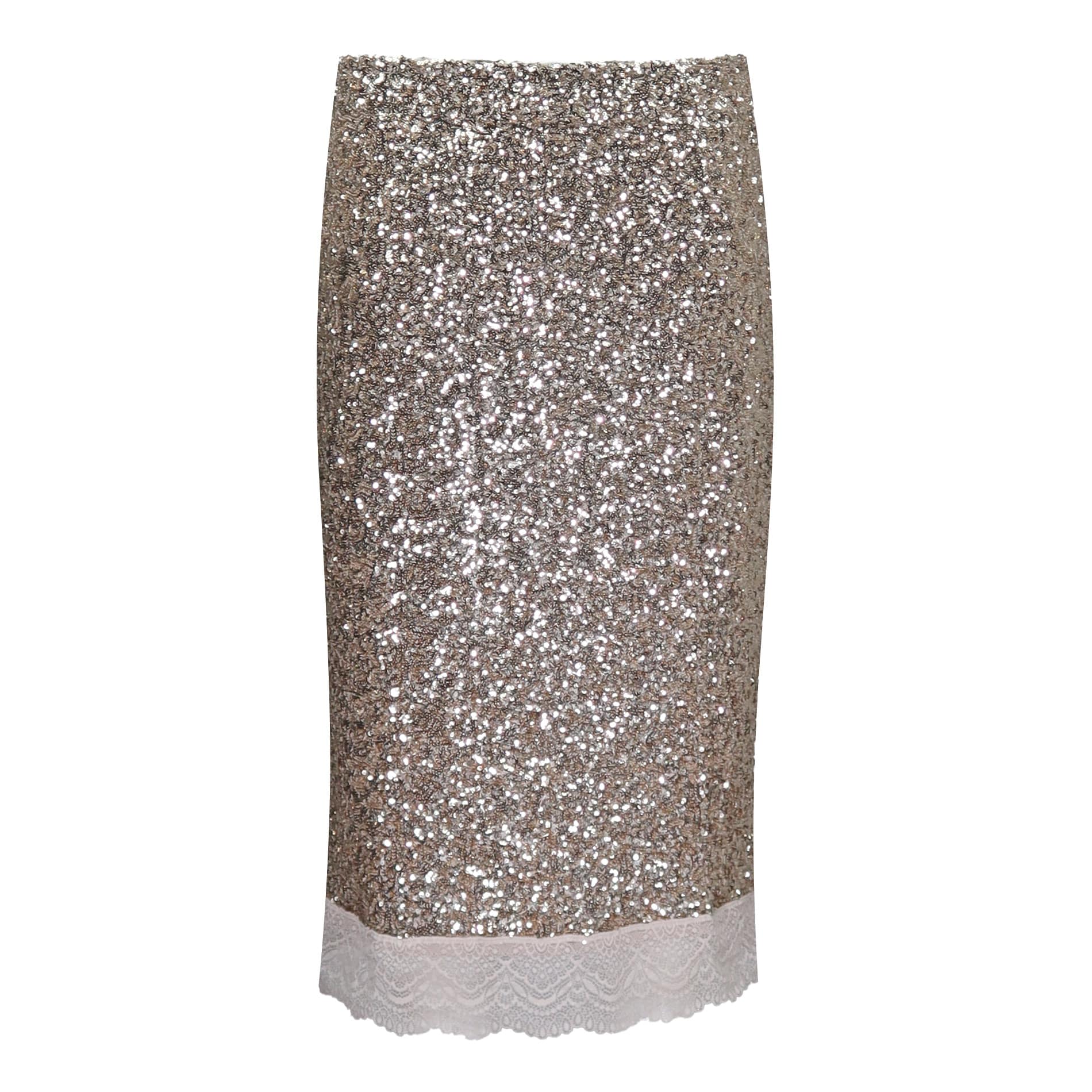 Pailletten midi rok van Princess goes Hollywood, model Sequences skirt in cream beige. Deze rok is gevoerd en is geheel bezet met beige pailletten met een strook kant aan de onderzijde. De rok heeft een elastische taille, ritssluiting aan de zijkant en valt onder de knie.