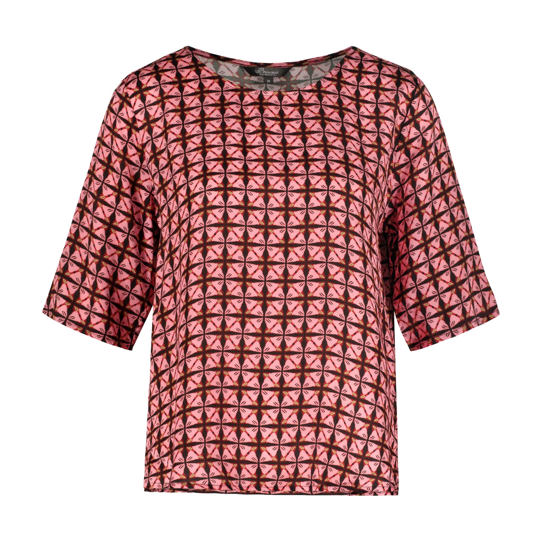 Roze blouse van Princess goes Hollywood. Deze losvallende blouse heeft een roze basis met een herhalend motief. De blouse heeft een ronde hals, korte mouwen en een rechte pasvorm.