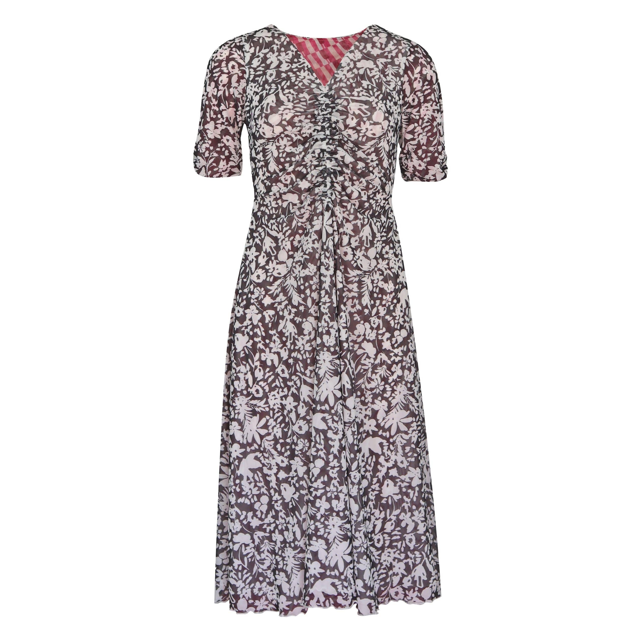 Roze kleedje van Princess goes Hollywood, model mesh reversible dress in graphic pink. Deze jurk heeft een aansluitende, geplooide body en korte mouwen. De jurk is gemaakt van een mesh stretch stof en heeft een all over print met roze en willte rechthoeken. Je kunt deze jurk omkeren en dan draag je een zwart witte versie.